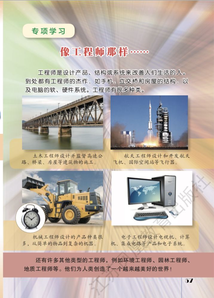 科学探究的程序和方法,工程设计的步骤与要领是科学课程重要的学习内容。为此,在每册教材的后面设有专门的“专项学习”,将有关科学探究和工程设计(含科学思维与工程思维)的指导系统化和显性化,在保证过程完整的基础上,将探究和设计要素按年级有所侧重,又螺旋上升地加以编排。