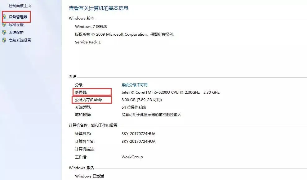 在属性选项卡里可看到基本的CPU及内存配置,更详细的配置资料点击选择左侧的设备管理器!