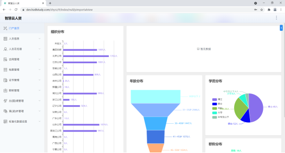 汇智云人资是一款为企业研发的通用人力资源管理系统,登录后可以进行相关的管理功能,包含人员信息管理、 人员花名册管理、合同管理、档案管理、证书管理、职称管理、出(国)境管理、离(退)休管理、标准化数据设置等功能。