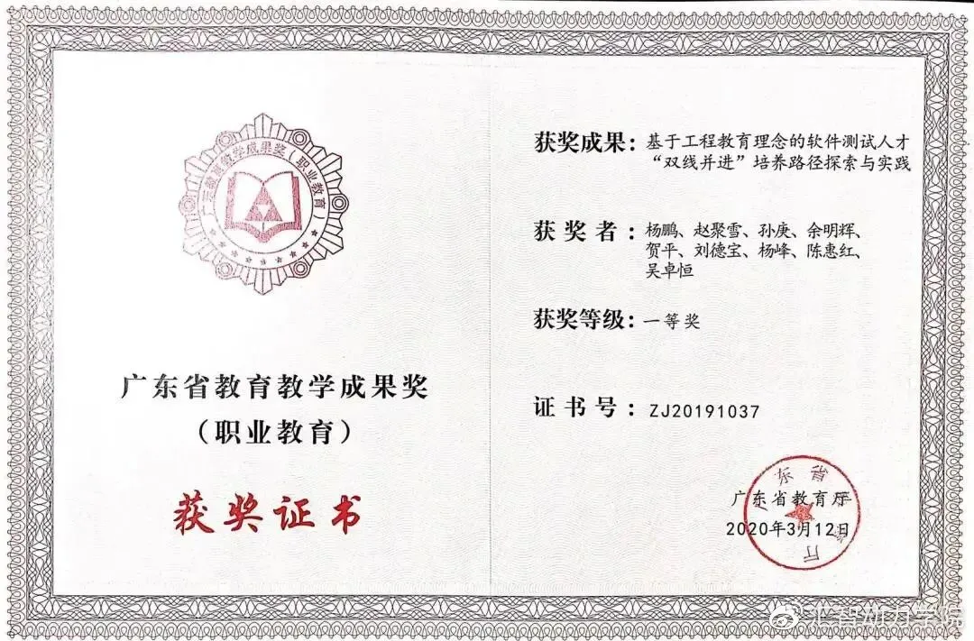 2020年3月12日,汇智动力学院的刘德宝老师,作为广州番禺职业技术学院特聘副教授、现代产业导师、ISTQB认证讲师参与的项目:“基于工程教育理念的软件测试人才‘双向并进’培养路径探索与实践”荣获2019年广东省教育教学成果奖一等奖!此项目同时荣获2020年度CCF VC产教融合优秀案例奖!