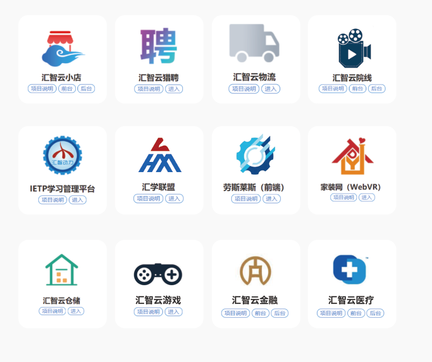 如今,平台自主研发有系列“汇智云”产品,涉及服务业、农业、工业、园区、大数据可视化平台等多个方面: