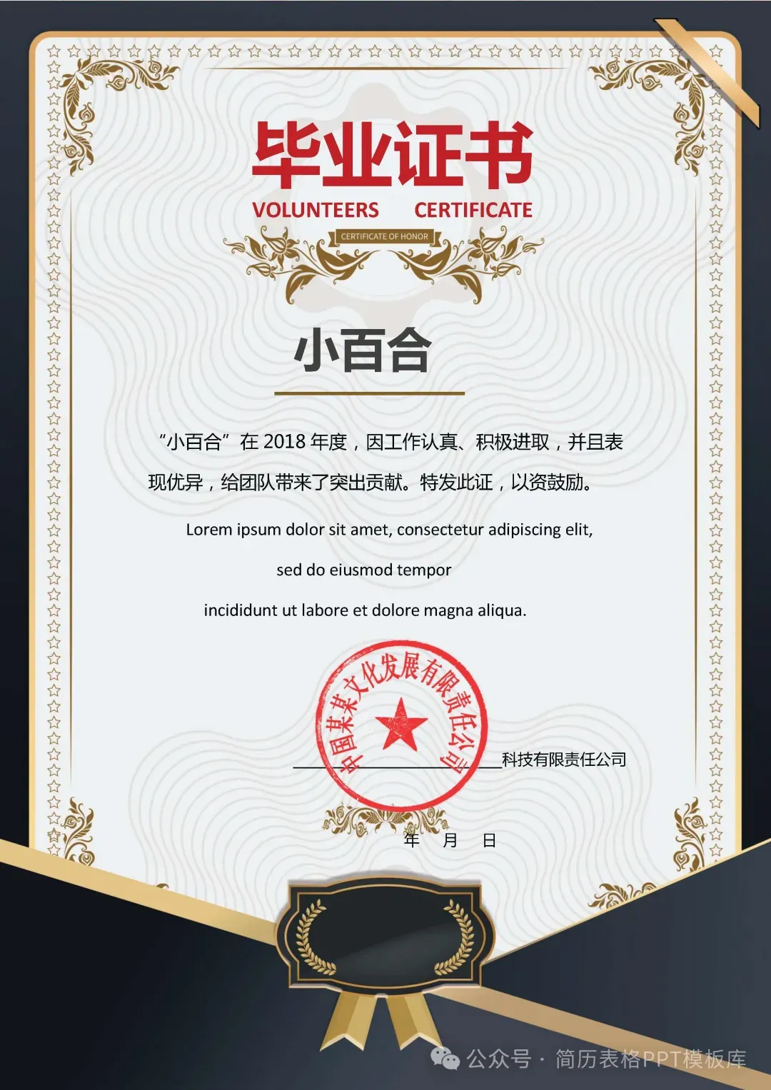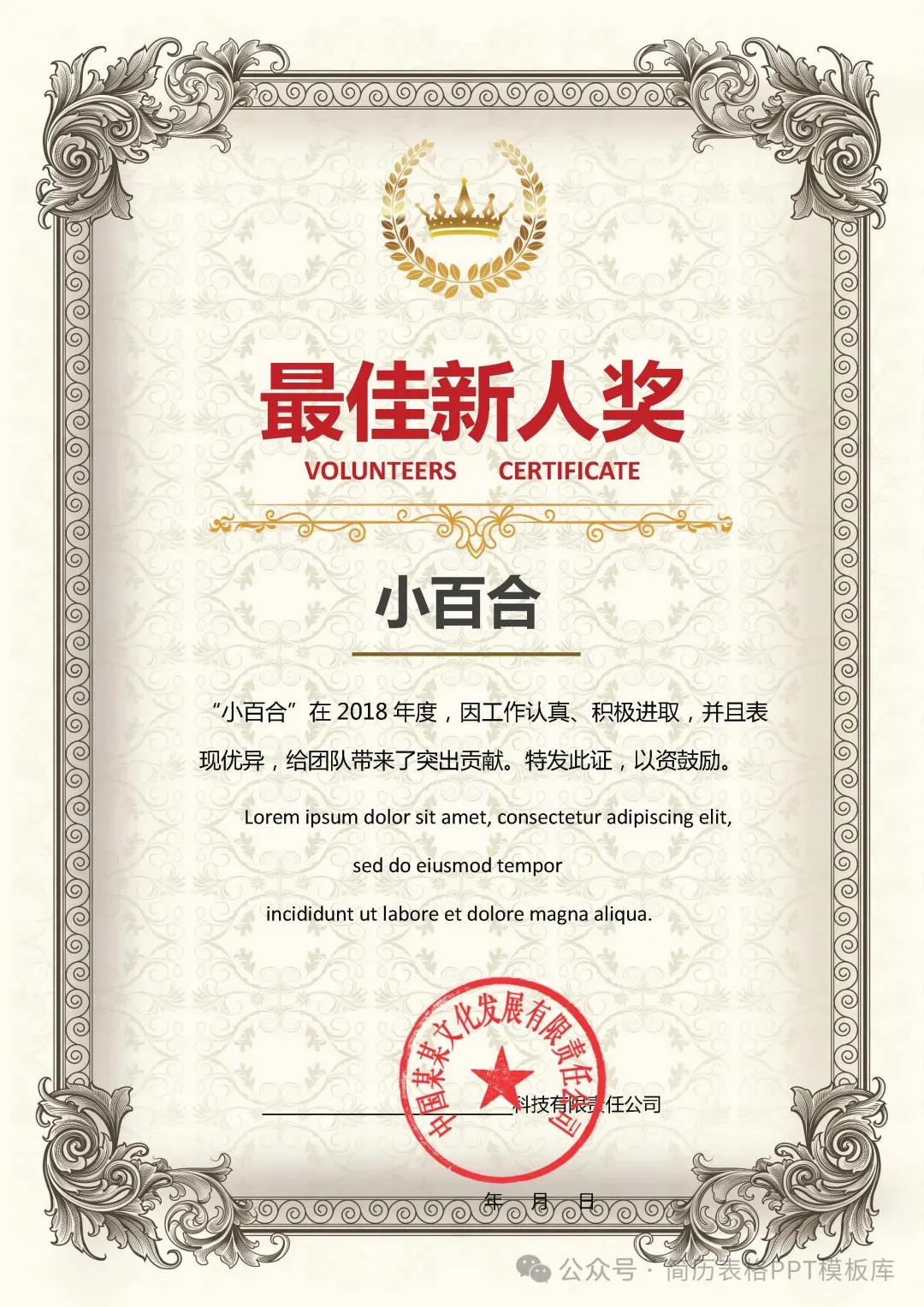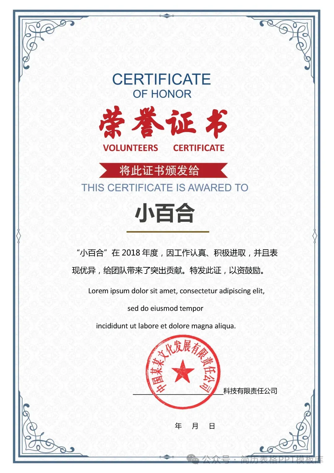 更多优质“PPT”“文档“”表格“”简历“资源关注我每天更新,一定要点个关注不迷路哦!另外本号接入了智能AI可以智能回复本号所有资源哦,快试试吧。荣誉证书作为正式的表彰凭证,核心价值是 “认可成果、激励行为”,设计上需遵循 “简洁庄重、信息明确” 原则,适配职场、校园、活动运营等多场景,尤其适合公众号博主作为粉丝激励、学员表彰、资源福利的配套内容,具体使用指南如下: