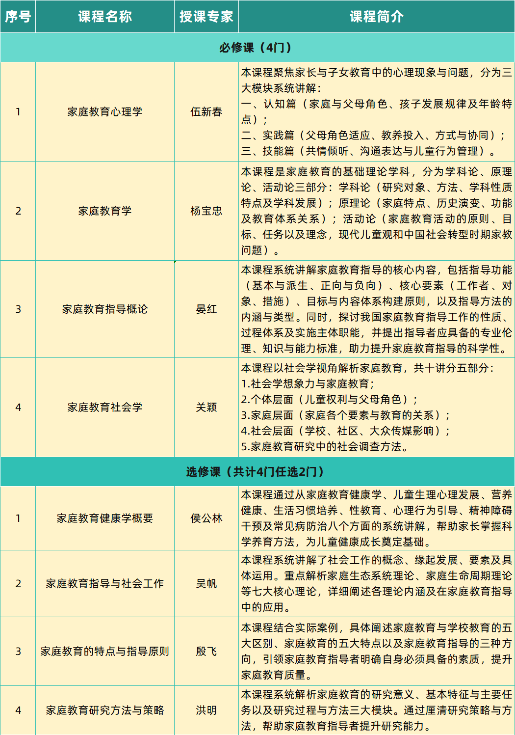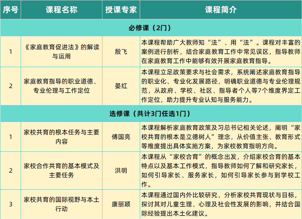 线上培训课程分为理论基础、政策解读、家庭教育指导实务操作三个模块,每个模块分为必修和选修两个部分,课程目录及简介如下: