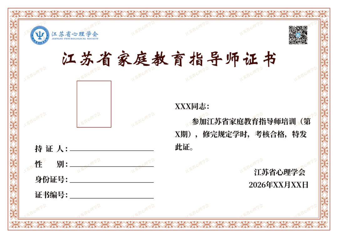 考核合格者由江苏省心理学会颁发“江苏省家庭教育指导师”证书,证书编号唯一,并可通过学会官方平台查询验证。项目组将持续为学员提供学术交流、专业发展等后续支持服务,助力职业成长。