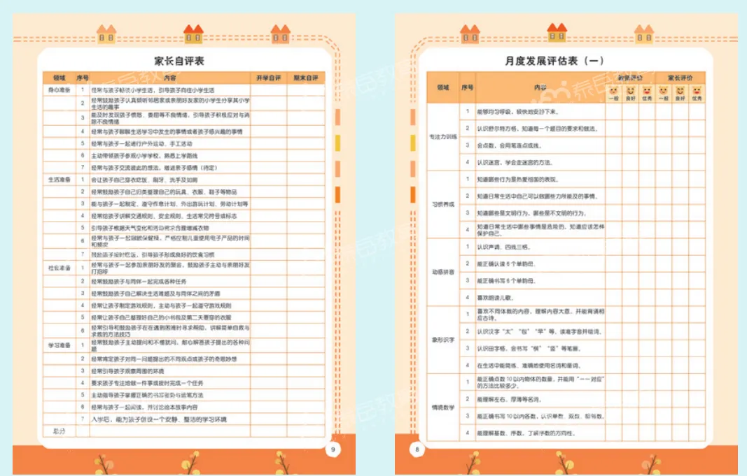 家园共育手册(含产品介绍、月度评估、家长和孩子自测表以及亲子游戏)。
