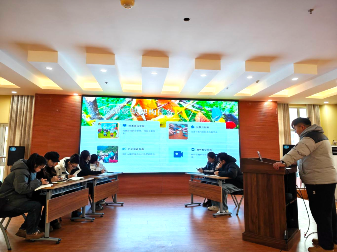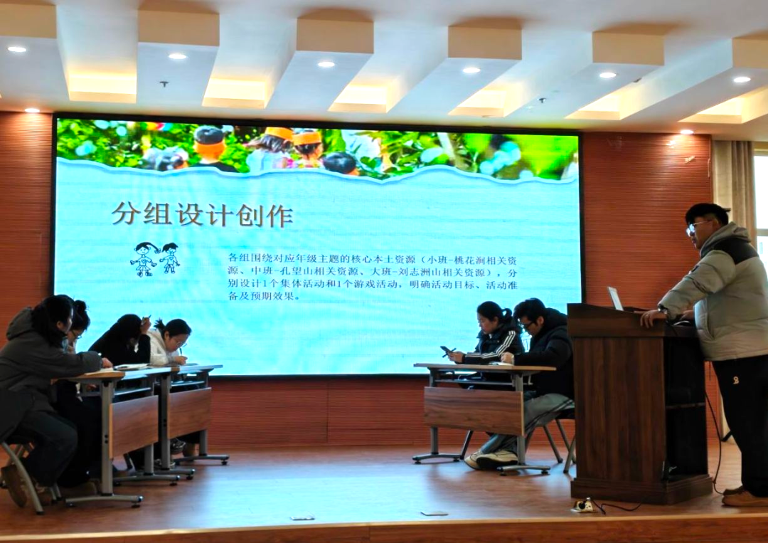 活动伊始,主持人孟老师以生动的PPT为载体,深入解读了本次课程开发“童趣化、生活化、游戏化”的核心理念,清晰梳理了“本土资源→课程资源→幼儿发展”的转化逻辑,让在场教师对教研目标有了明确认知。