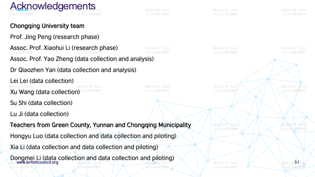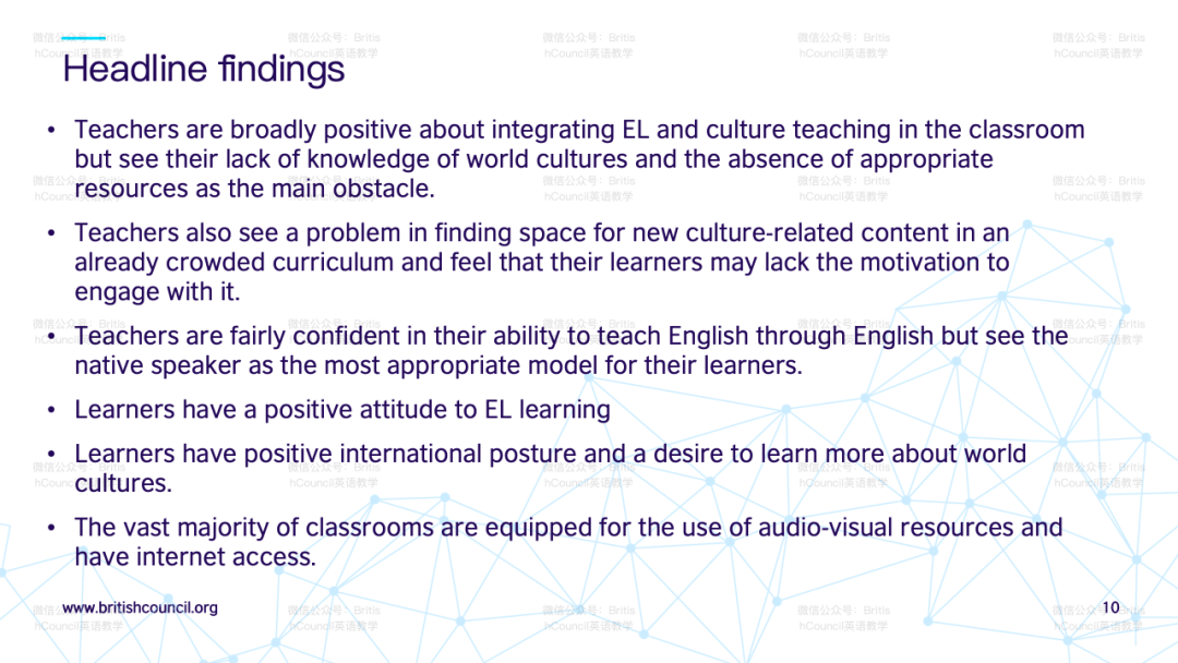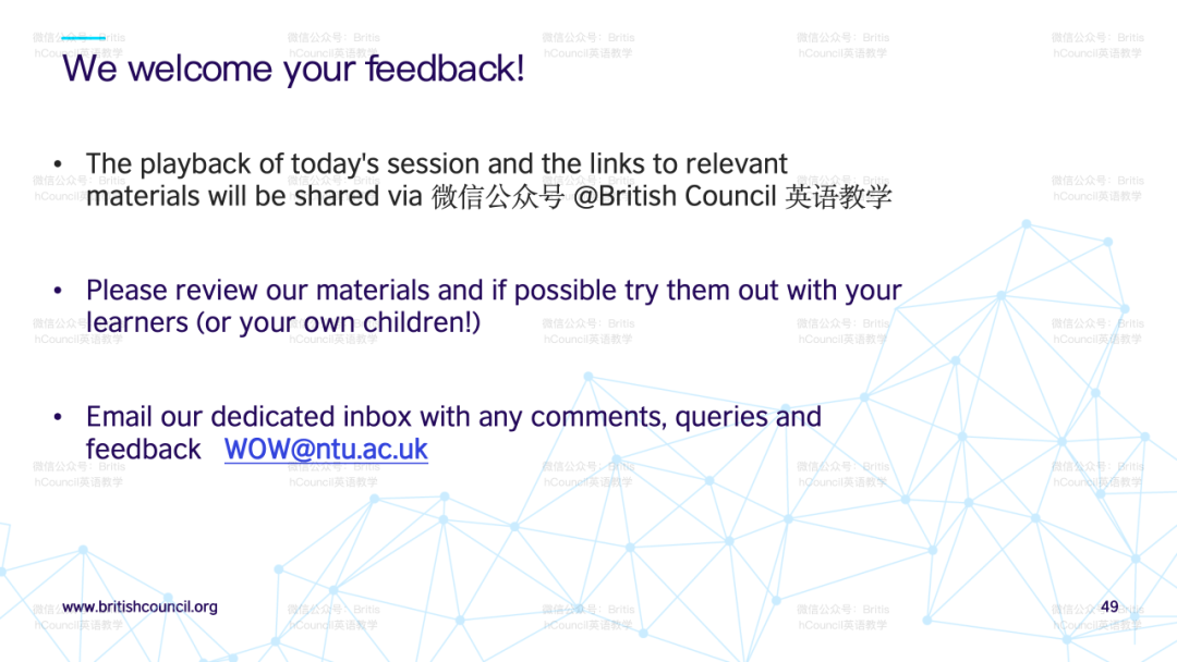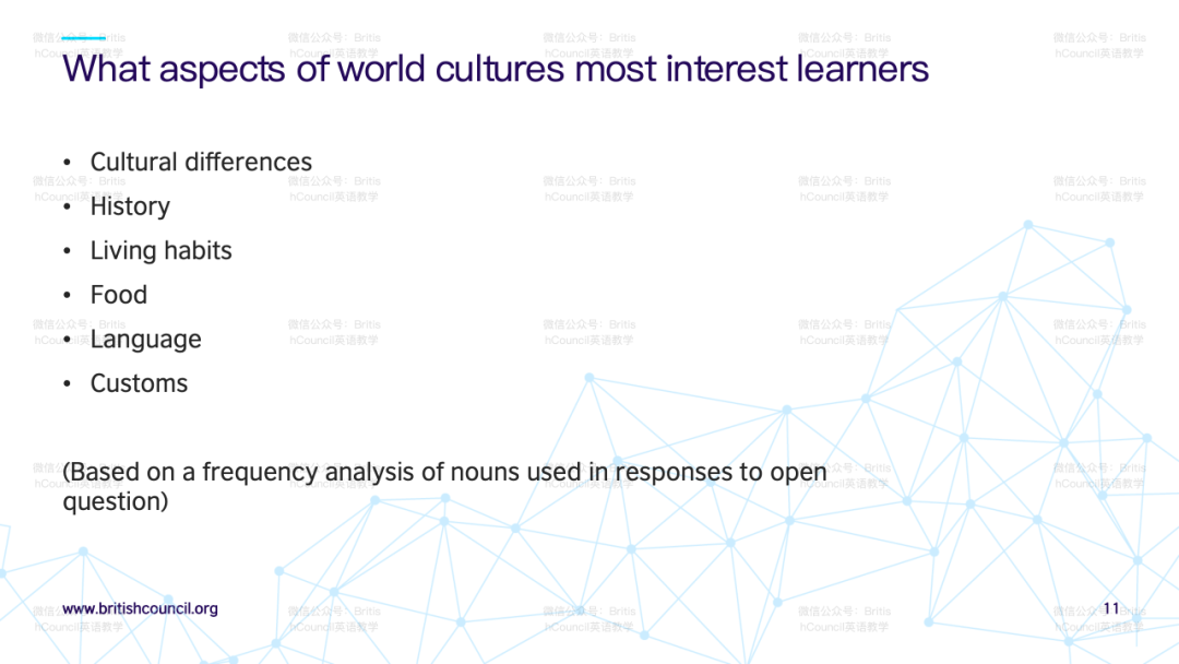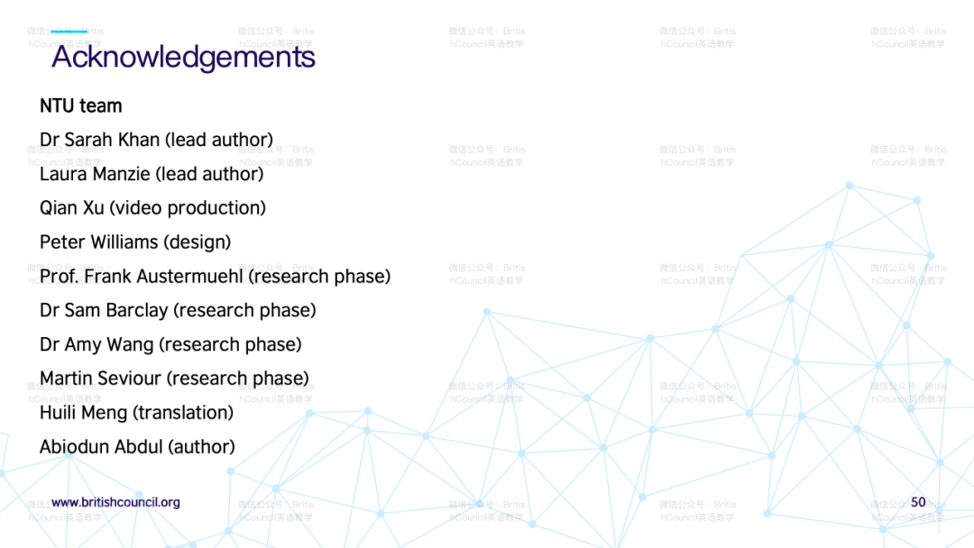 针对如何发展教师自身文化意识的问题,演讲者提到本项目的研究报告内会有汇编的阅读清单与大家分享,以丰富教师在语言教学中整合跨文化学习的理解。该报告将在英国文化教育协会官网中提供下载。