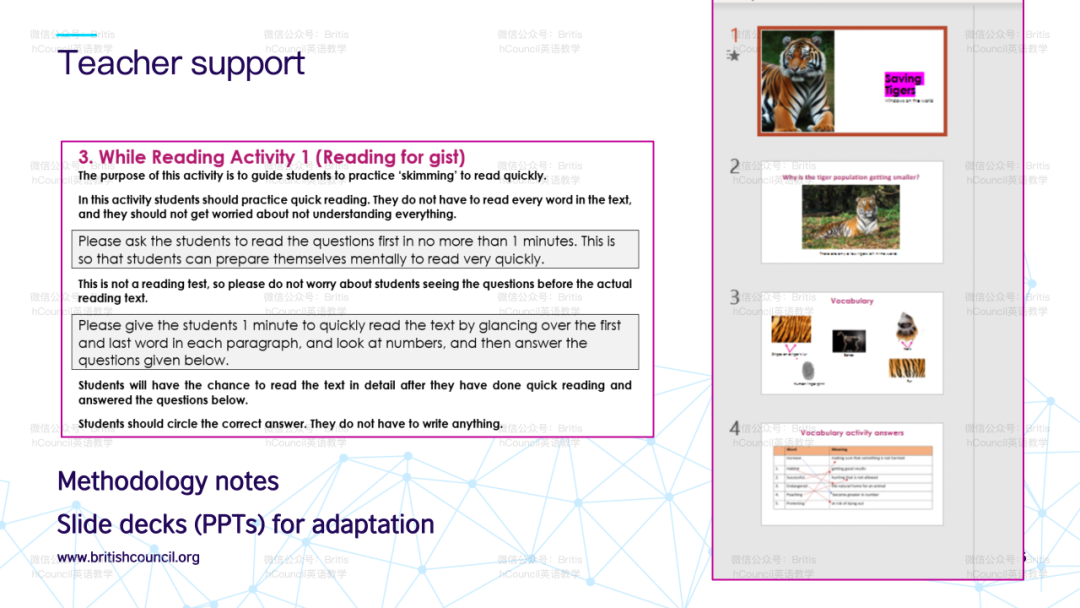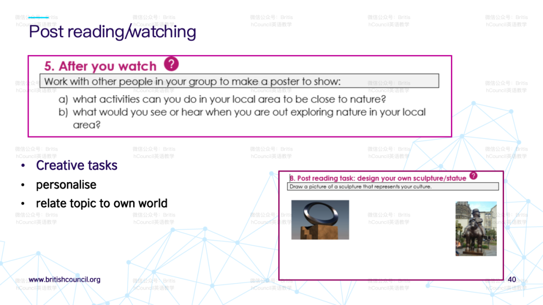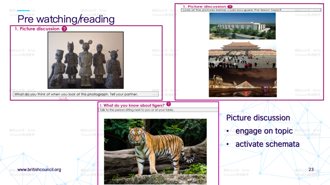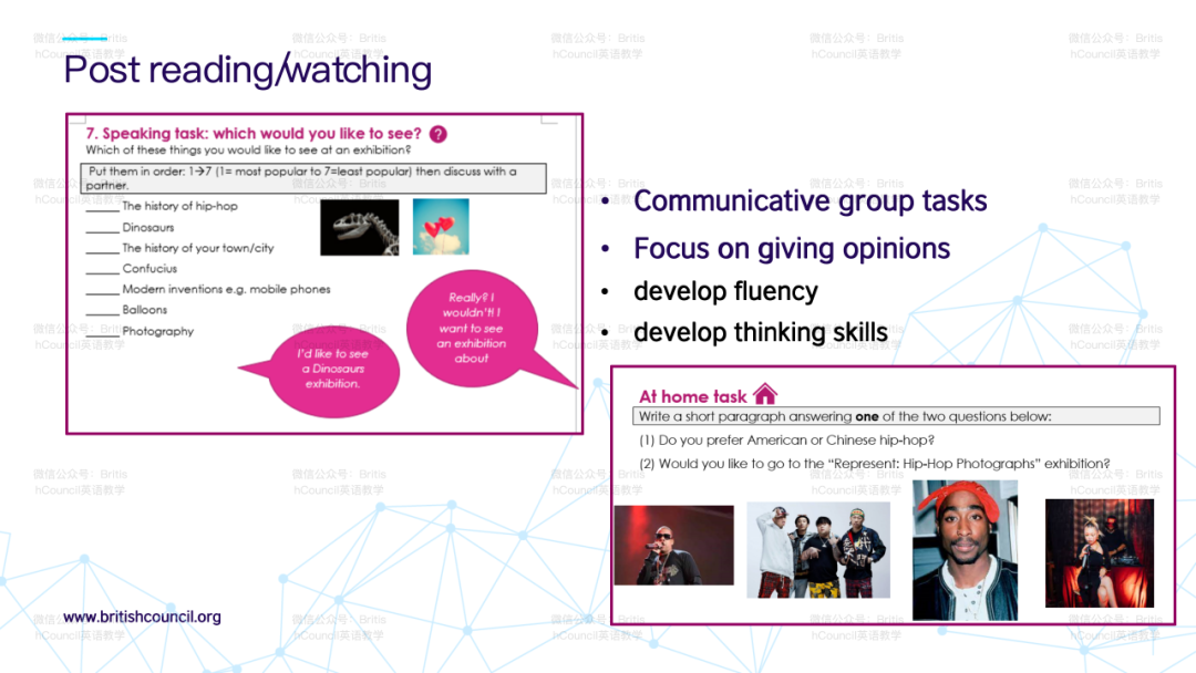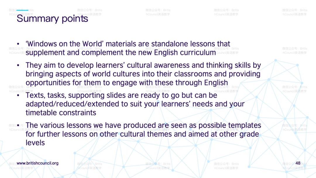 针对如何发展教师自身文化意识的问题,演讲者提到本项目的研究报告内会有汇编的阅读清单与大家分享,以丰富教师在语言教学中整合跨文化学习的理解。该报告将在英国文化教育协会官网中提供下载。