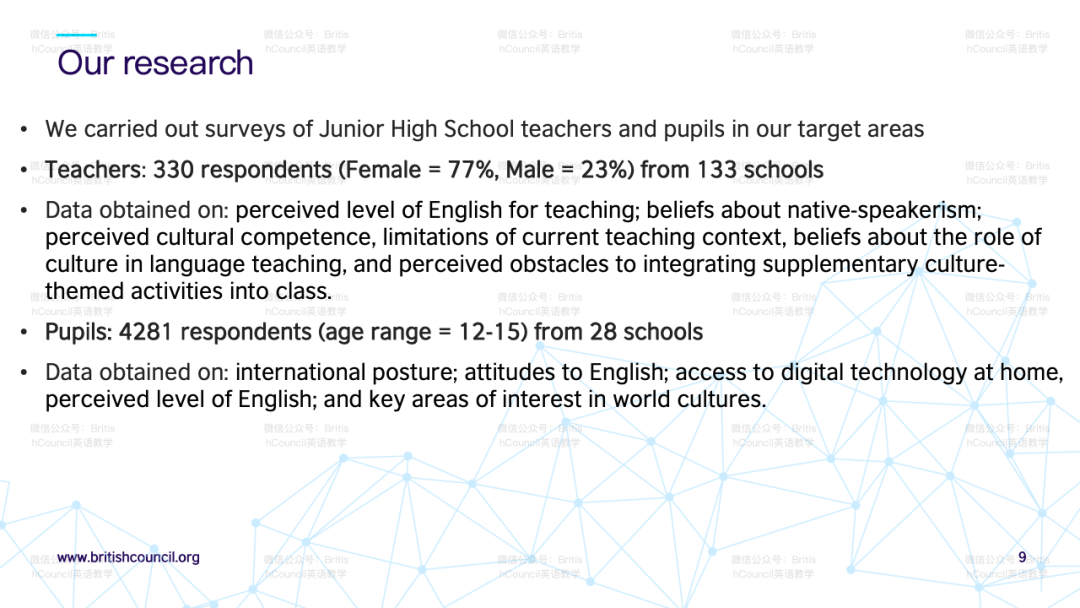 The presenters provided a brief overview of some key findings that emerged from their surveys of Chinese junior high school teachers and students in Chongqing and Yunnan.