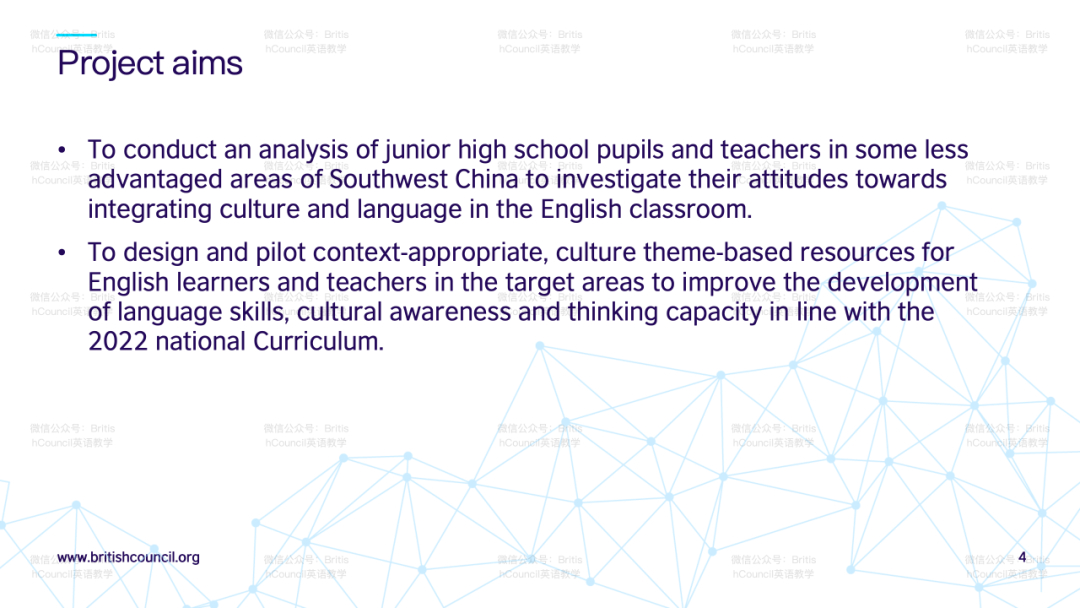 As outlined by the speakers, the project had two broad aims. The first was to carry out an investigative study through surveys of junior high school teachers and students in the targeted regions of Southwest China. The goal was to analyze their perspectives and attitudes on integrating cultural content and language learning in English lessons.