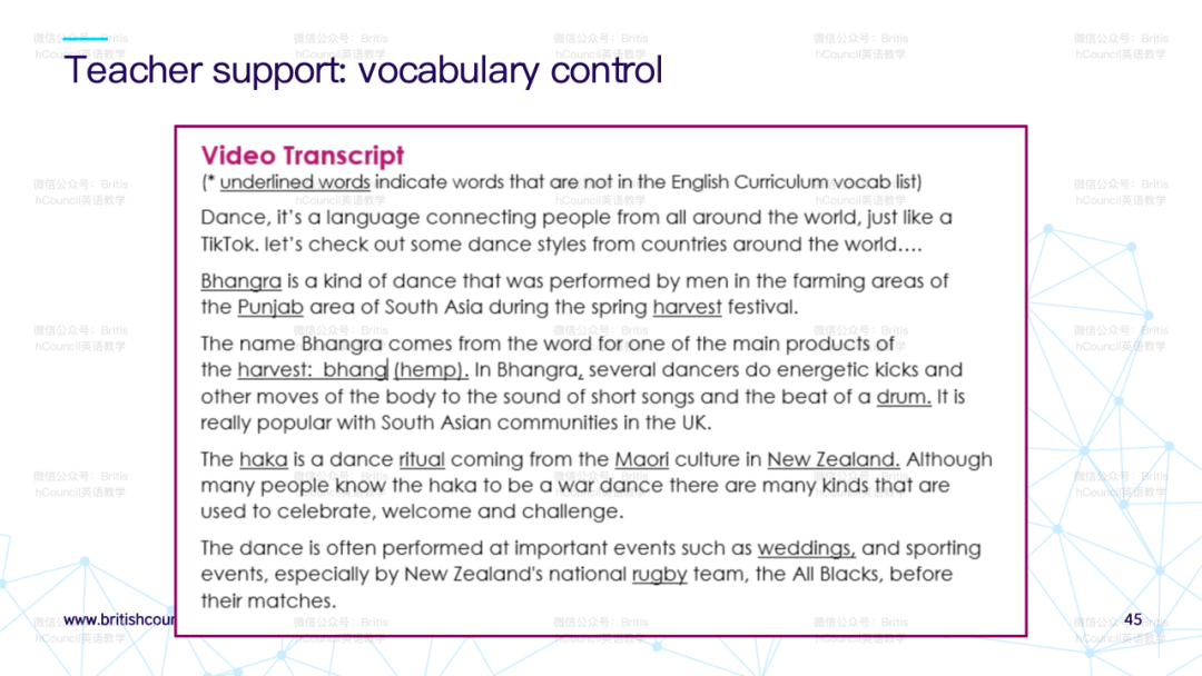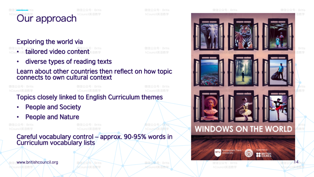 Great care was taken to control the vocabulary level in the materials to match the vocabulary lists prescribed in China's national curriculum. The texts, videos and tasks were designed to be accessible for students at relatively early stages of English proficiency.