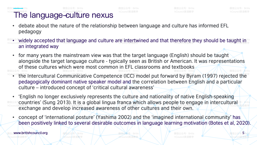 发言人提到了在英语教学中探讨跨文化的一些关键理念。在过去,英语教学的主流观点曾倾向于将英语与其主要文化(即英国和美国文化)一起教授。然而,Claire Kramsch等应用语言学学者在20世纪80年代和90年代对此提出了挑战。他们认为英语应该促进跨文化交流,而不是推广任何单一文化。相应地,Byram提出的“关键文化意识”理论鼓励英语学习者培养对全球共同体的理解,了解不同文化并进行比较。演讲者还提到了Yashima提出的“国际态度”概念,这一概念能够激励英语学习者。即使学习者很少直接接触不同文化,他们也可以构建一个想象中的全球共同体,这为他们提供了更广阔的跨文化视角和积极的语言学习态度。