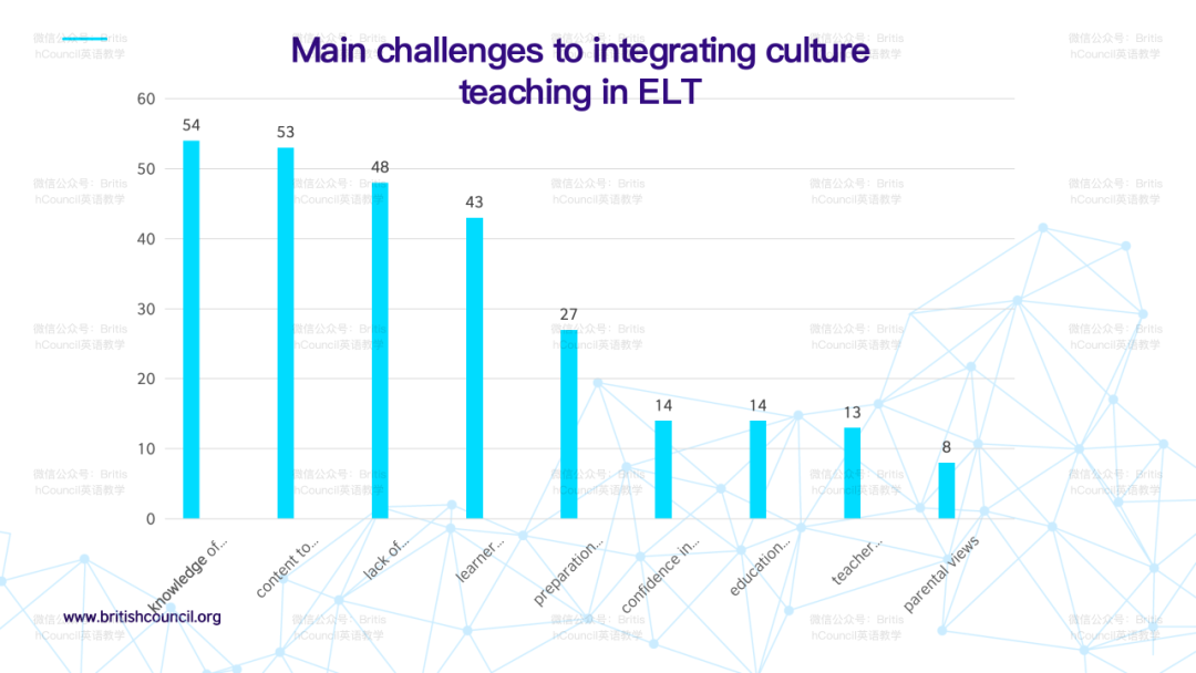 在调查中,教师表达了将文化元素融入英语课堂的积极态度,但感觉自己对全球文化的知识匮乏,并缺乏相关的教学资源和材料。此外,一些教师担心增加更多文化内容会影响学生的学习动机。然而,大多数教师认识到需要这种材料并表达了对此的强烈需求。从学生的调查反馈来看,他们对学习英语表现出积极的态度并表示对学习各种世界文化知识感兴趣。学生调查发现,大多数课堂都具备在课堂上使用视听材料的技术条件。学生确定的文化兴趣话题包括跨文化差异、历史、生活习惯、食物、风俗传统等。