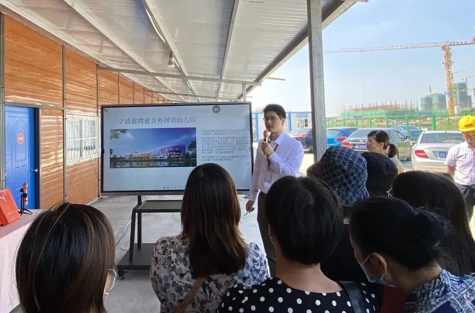 家长们从慈中书院出发,来到宁波前湾慈吉外国语学校的建筑工地参观。慈吉教育集团韩鑫豪总经理向家长们介绍新校区规划、硬件设施和工程进展。