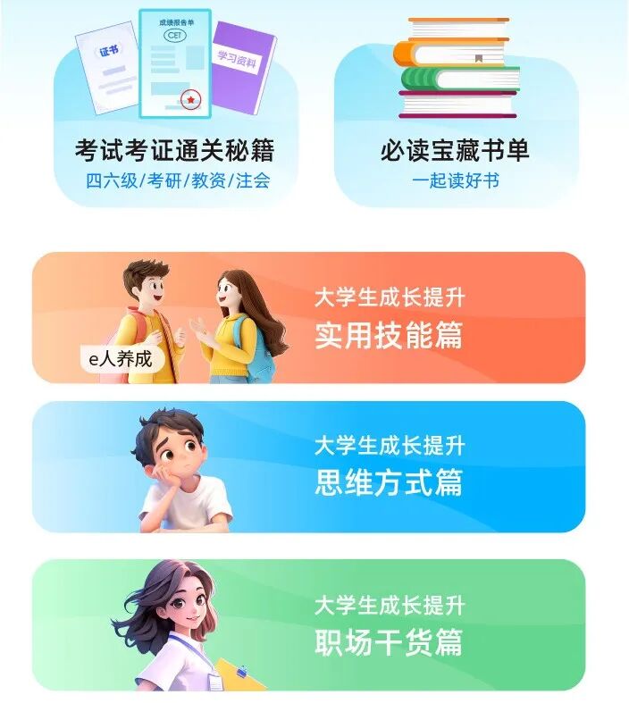 汇集各类资格证、考研、四六级备考秘籍,搭配思维提升、职场技能精选书单,助你提前规划、赢在起点。
