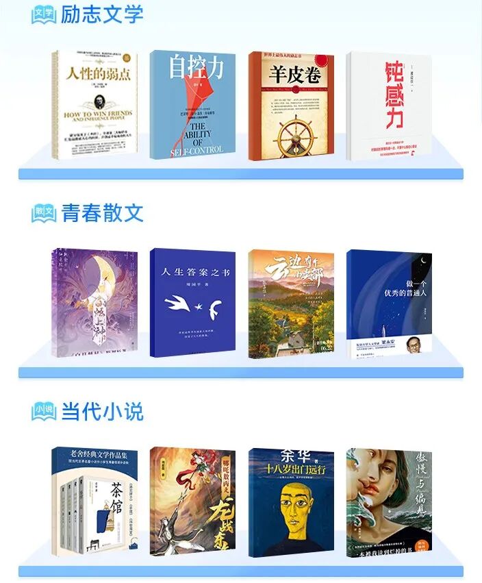 精选励志文学、青春散文、当代小说等必读经典及优质读物,助力课外拓展,培养阅读习惯,让成长路上书香作伴。