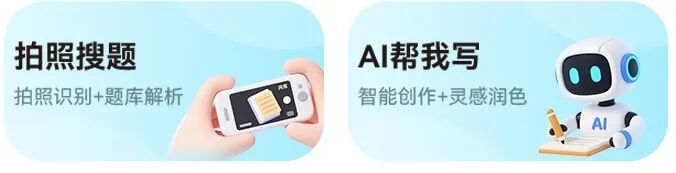 「拍照搜题」拍照即可识别题目,解析快又准,难题轻松拿捏!「AI帮我写」智能润色、激发灵感,作文作业不犯愁!