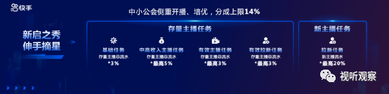 月流水小于等于50万的小型公会:完成“新手任务”,就可在存量主播身上最高可获14%的结算比例,同时原有的新主播20%额外返点政策也会保留。