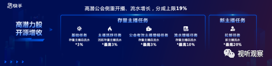 月流水超过500万的大型公会有权利选择“成长任务”或者“成熟任务”:对于月流水超过500万的大型公会来说,只要该公会当月流水无明显跌幅,且保持一定的开播规模,公会即可拿到最高8%可预期的收益;对表现积极的公会,快手最高还将给予其增量部分流水30%的额外返点。