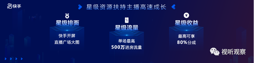 根据主播不同的条件,发放不同等级的资源包,解决主播在平台冷启动期所需要的流量和牌面问题。资源包包含2类,一是首秀资源包,主播首秀期间,直播间最高实现500万人在线观看,平台还会安排额外的开屏、海报大图等顶级资源位推荐;二是日常资源包,连续90天时间里,快手给予最高单天300万人在线观看人气和优质推荐位的曝光。