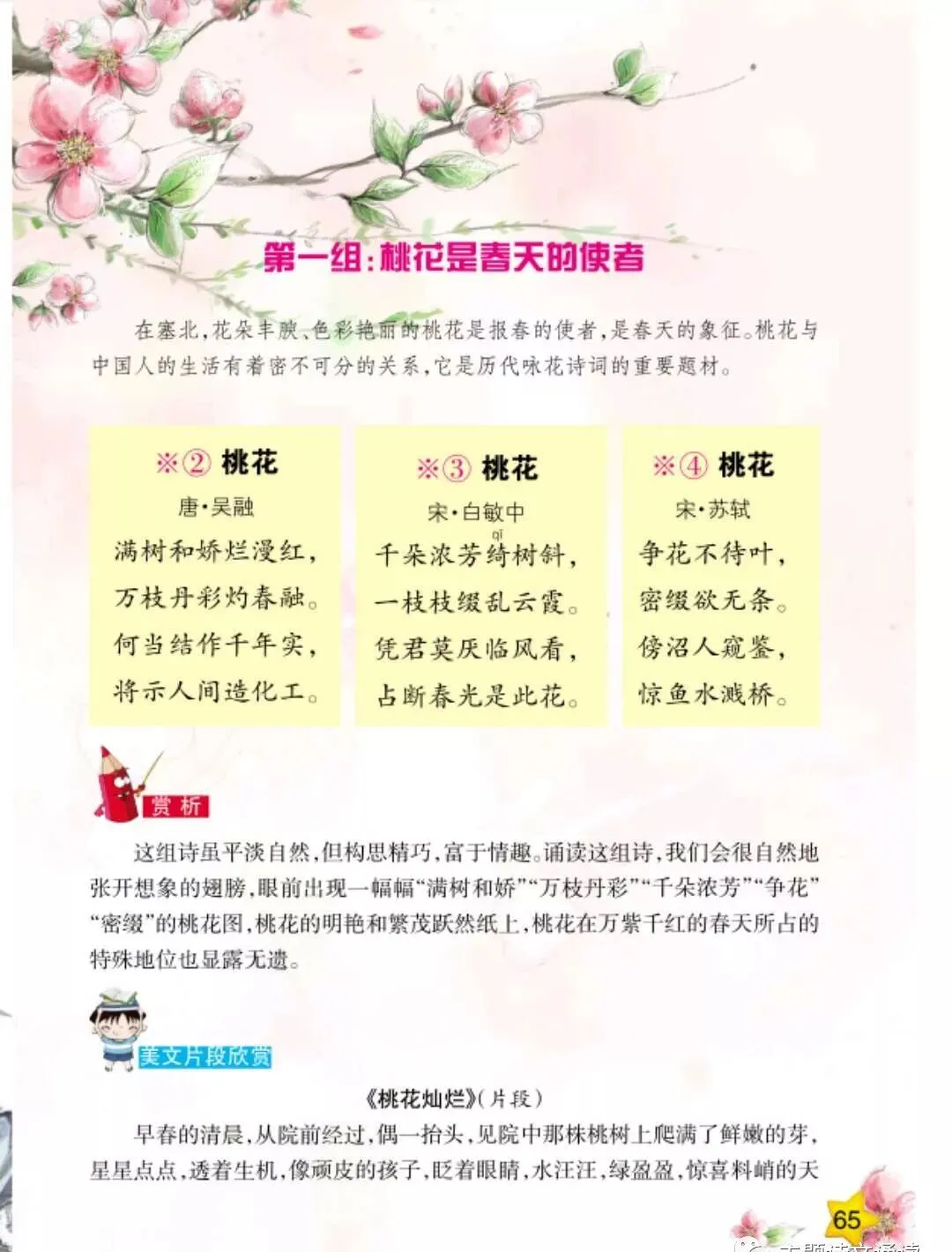 这期内容中,我们一起欣赏各地使用《主题诗文诵读》教材学校学生的桃花习作与自创诗。请大朋友们将这期内容转发给各地的小朋友,让他们在最适合的时节学习怎样看桃花、写桃花吧。