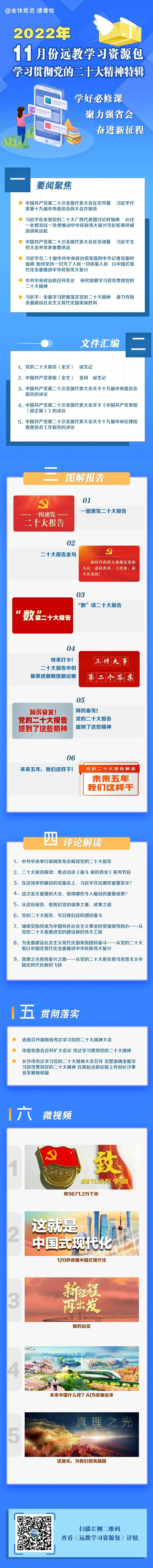 广大干部群众要原原本本学习研读党的二十大报告和党章,认真领悟党的二十大提出的新思想新论断、作出的新部署新要求。先锋潮·长沙党建推出《远教学习资源包·学习贯彻党的二十大精神特辑》,为全市基层党组织和广大党员提供学习参考。