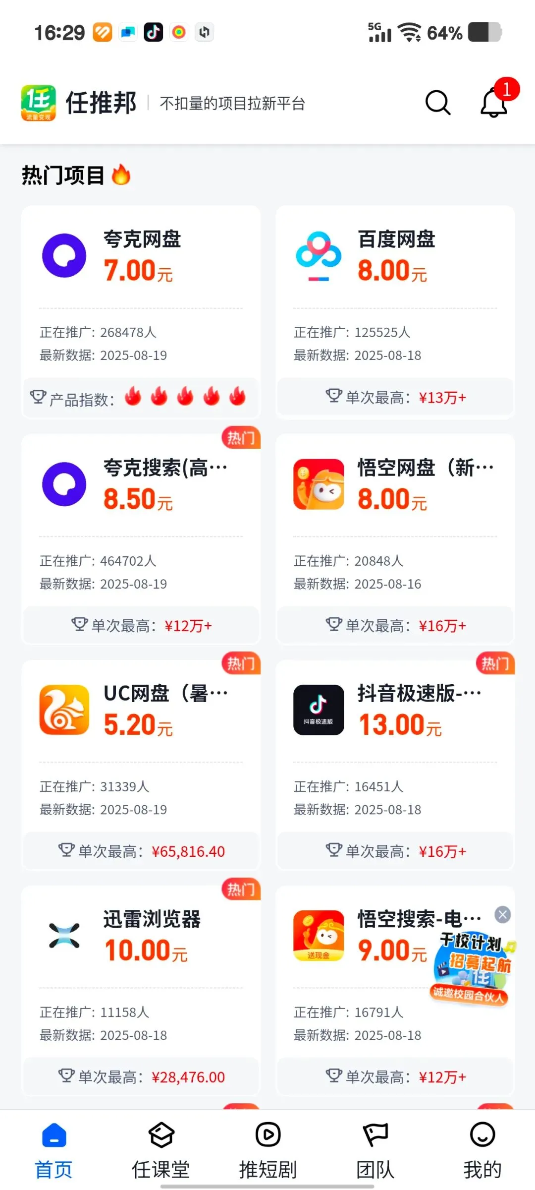 要说现在最火的网盘推广平台,那必须是任推邦!这个平台简直就是推广党的"提款机"——专门帮人对接各大网盘的拉新任务。