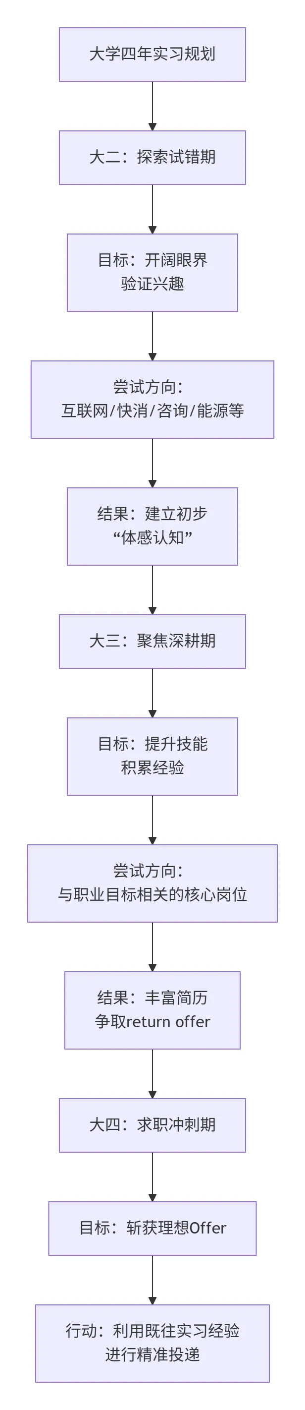 为了让他更直观地理解我是如何将“实习”这件事系统化地嵌入整个大学规划的,我结合我们之前的讨论,为他梳理了下面这张“阶梯式实习”规划图: