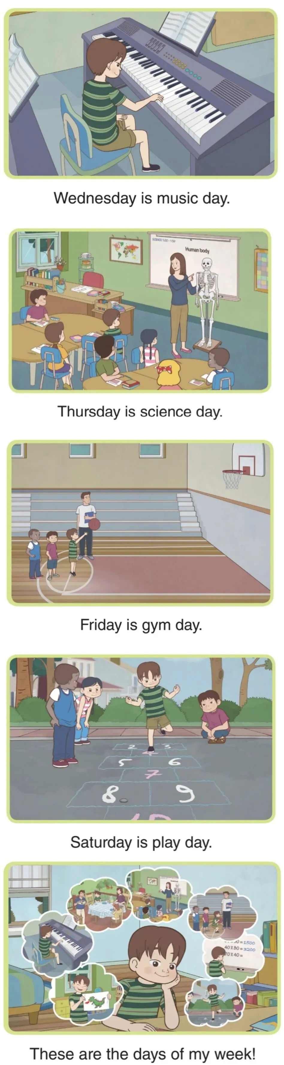 🎹唱 Wednesday 时,做弹钢琴的动作(对应绘本music day )