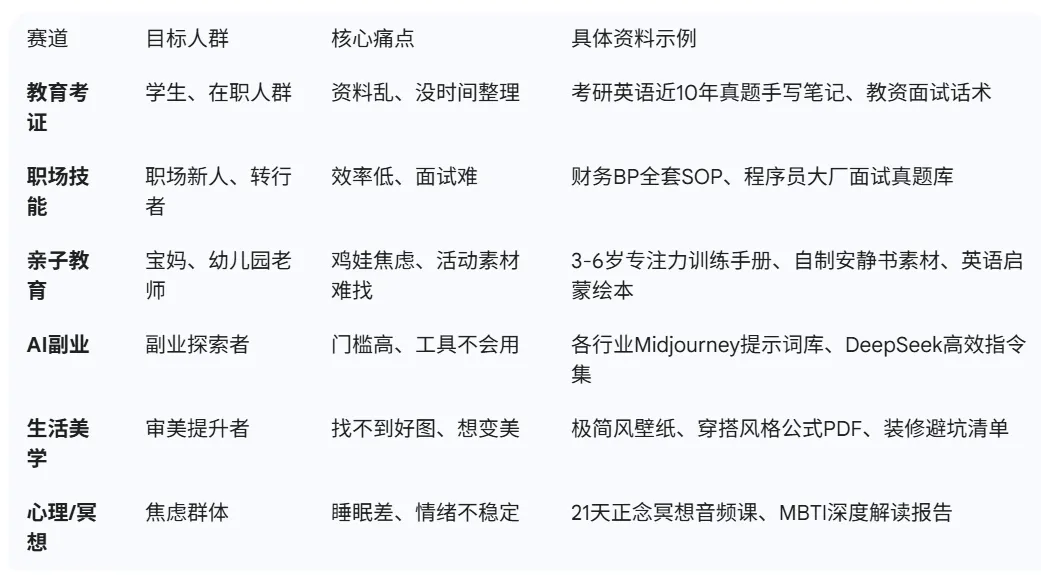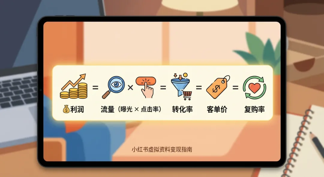 要在小红书靠虚拟资料实现月入过万,咱们不需要靠运气,而是根据变现的本质,去提升这些指标:$利润 = 流量(曝光 \times 点击率) \times 转化率 \times 客单价 \times 复购率$看起来挺复杂是吗,其实不是,反而是给我们指明了努力的方向,这里我列出来,不懂也没关系,下面的章节我还在详细的拆解,所以大家不要被陌生的名词吓到:复购率: 靠的是“资料的真实质量”和“用户关系”。以前做虚拟资料靠的是“信息差”(我有你没有),但是你说现在网络这么发达,大家的“搜商很高”,这一套不好使了;现在做虚拟资料靠的是“认知差”(我懂AI,能把碎片信息整合成系统方案)和“审美差”(我的资料排版更精美,封面更吸引人)。你的价值不在于创造了信息,而在于你从信息的汪洋大海中,为特定人群筛选出了最实用的那些。我昨晚讲课的时候,特意用AI查了,不多解释,给大家附上AI的解释,写的比我好,再次提示,不要被名词吓到,这次你知道了,以后看到就不害怕了,不过是种叫法而已很多新手入行时,第一反应就是去做“考研资料”或“简历模板”,因为大家以前就见过这些,没有见到的怎么可能去做到呢。这些赛道确实需求大,人群基数也比较大,但是同行都在盯着,已经变成了极度内卷的“红海”。在2026年,聪明的小伙伴会寻找那些“刚需、高频、且具有特定门槛”的领域根据大数据反馈和变现效率,我们梳理出以下五个最具潜力的细分方向:大家不要做“全国英语四级”,这种又泛又大的词一般都是红海了,咱们要做的细分一点,比如“XX省考公面试真题深度解析”或“XX大学某专业考研内部手写笔记”。一个是通用的大领域,一个聚焦到某个地区、某个学校的小领域,这样更容易卖高客单价高溢价点: 地域差异、特定院校、特定年份的稀缺性。家长对孩子的投入是不计成本的,良人自己也有两个孩子,真的是吞金兽,无论买啥都会在自己能力范围内,给他们最好的。具体选品: 3-6岁专注力训练纸、自制逻辑思维安静)、小学生古诗词全脑联想记忆图谱....高溢价点: 解决了家长的“辅导焦虑”和“时间成本”。我们从小到大都是应试教育,一切行动都期待有一个万能的指南,我们只跟着操作就好了,这样才有安全感,比如说财务可能需要一个会计入门、税务入门的知识;文员行政岗就想学习一下office入门...26年,刚才说了,是全民深度使用AI的一年,很多人可能想在自己能马上实操的层面,把AI用起来具体选品: 各行业DeepSeek深度提示词库、Midjourney商业摄影参数合集、自动化Excel财务报表模板...说实话,当我们用上顶级的AI模型之后,发现“提示词”就是个笑话,好的AI模型并不是靠提示词给出好答案的,有时候不是提示词的问题,是你选的工具不对。就像你让一个专科生写一篇硕士论文,给出来各种辅助,写出来还是不尽人意啊,但是你让一个专业对口的博士生来写,朋友们,你们觉得还需要复杂的提示词吗?扯远了,说回正事儿,这个提示词管他有没有用,但是是有需求的,有需求就可以去卖了。高溢价点: 降维打击。你卖的不是资料,是一份带有安全感的指南。大家都知道这两年经济不好,很多人就出现了各种焦虑,情绪价值就成了刚需。具体选品: 21天正念冥想自习手册、MBTI深度人格解析报告、极简主义生活复盘模板、治愈系电子手帐插件...具体选品: 小红书起号SOP手册、闲鱼自动化卖货流程、无人直播搭建指南。如何判断一个产品能不能爆?这需要我们与用户共鸣一下,这也是AI无法彻底代替我们人类的地方:- 痛点(刚需): 不买这个资料,我可能考不上、找不到工作、会被老板骂。(代表:考试资料、简历模板)