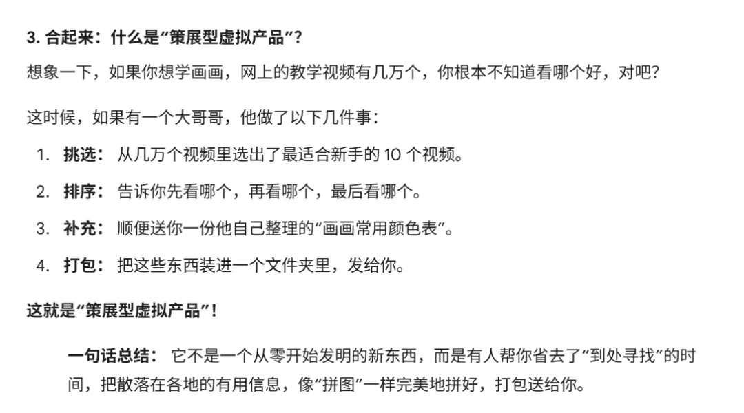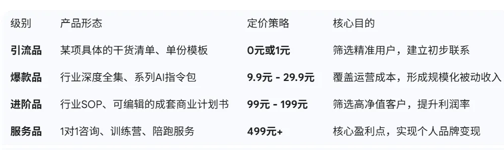 - 高级玩家: 卖解决问题的方案(资料 + 工具 + AI指令 + 1对1轻咨询)。价格:199元+。