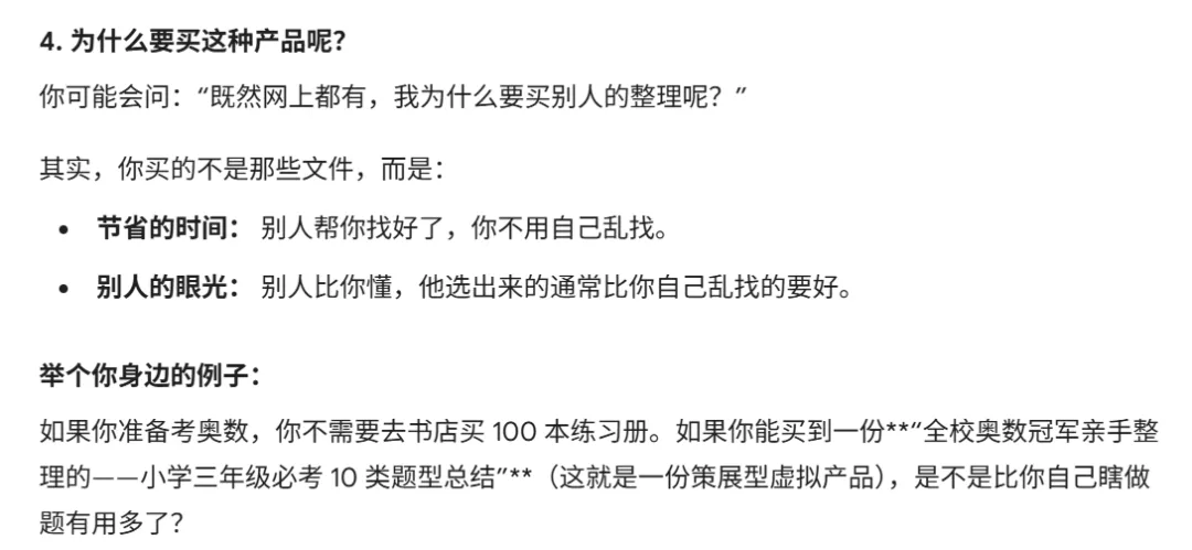 - 爽点(即时获得): 买了它,原本要干3小时的活,5分钟就干完了。(代表:AI指令集、自动化表格)