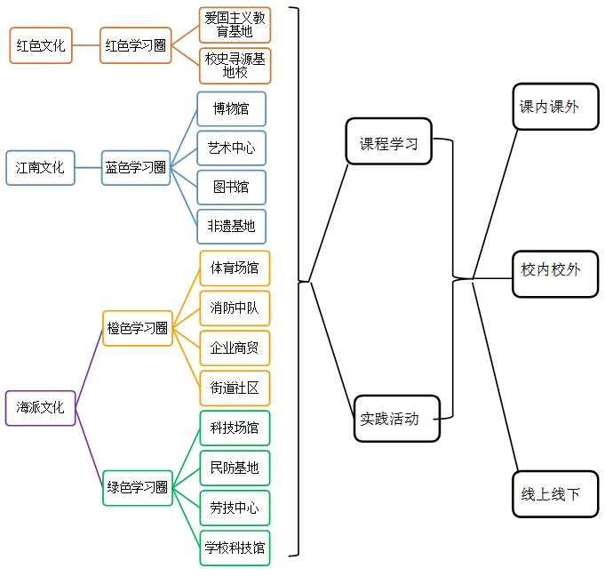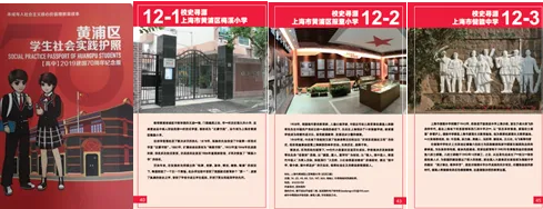 区域围绕三大文化品牌,即“用好红色文化,打造区域品牌”“传承江南文化,树立文化自信”与“发扬海派文化,积极进取创新”,开展区域样态探索,初步形成了“赤橙蓝绿学习圈”海派文化实践体验版图,形成区域德育资源架构(详见下图)。红色文化对接“红色学习圈”,主要是指“一大”会址、渔阳里等爱国主义教育基地;江南文化对接“蓝色学习圈”,涵盖了当代艺术博物馆、大世界、区图书馆等优秀文化的传习基地;海派文化对接“橙色学习圈”和“绿色学习圈”。“橙色学习圈”包括了银行博物馆、新世界百货等金融财商类教育基地,还有街道社区提供的跟岗服务岗位;“绿色学习圈”则串起了科普探索馆、电信博物馆等科技环保类基地。以“多彩学习圈”为蓝本,编制《黄浦区学生社会实践护照》(后面简称《护照》),作为黄浦区中小学生的社会实践指导手册,2020年同步推出《黄浦区学生社会实践护照》线上版,线上线下护照联动一体,拓展育人空间。