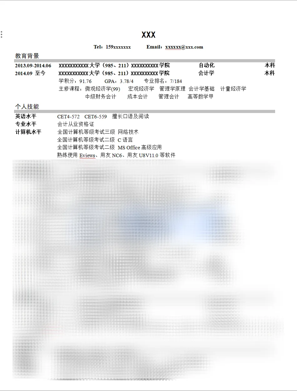 核心内容:个人基本信息(姓名、院校专业、绩点排名、联系方式)、教育经历(核心课程、英语成绩、各类资格证书)、科研经历、实习与竞赛履历、获奖经历等。