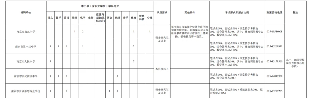 说明:高中、职业学校及《岗位信息表2》中岗位直接报名到学校(如南京市第九中学高中物理)。《岗位信息表1》中初中、小学合并岗位招聘,网上报名不到具体学校只到学科(如:初中语文)。