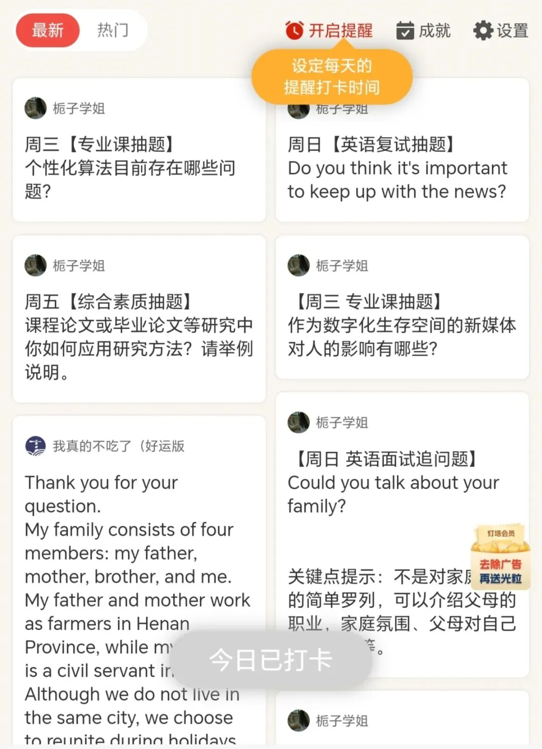 4.历年复试真题全力还原+各环节题库提供高效脱敏训练,灯塔打卡小程序每周带学