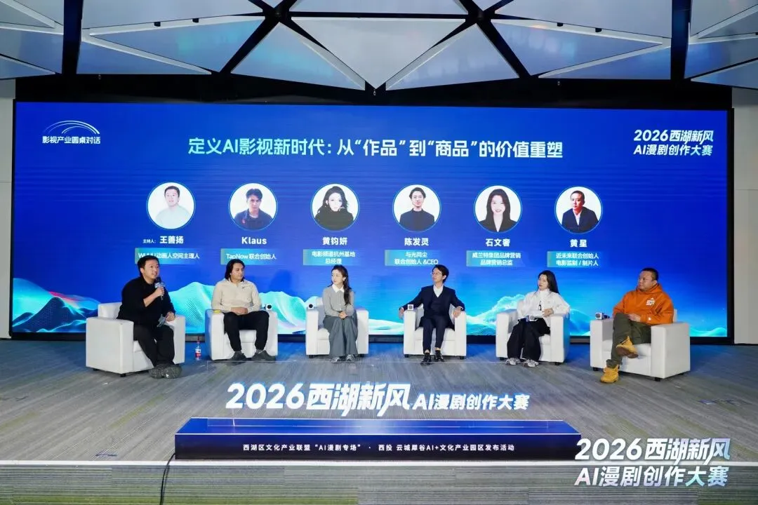 紧随漫剧产业的实战探讨,压轴登场的 “影视产业圆桌对话” 将视野拉升到整个影视工业体系。在 wuhu动画人空间创始人善扬的主持下,电影频道·杭州基地总经理黄钧妍、近未来联合创始人/监制黄星、与光同尘CEO陈发灵、TapNow联合创始人Klaus、威兰特集团品牌营销总监石文奢等五位来自平台、制作、品牌与出海渠道的领军者,围绕 “定义AI影视新时代:从‘作品’到‘商品’的价值重塑” 展开了终极思辨,为活动画上了一个兼具深度与远见的句号。