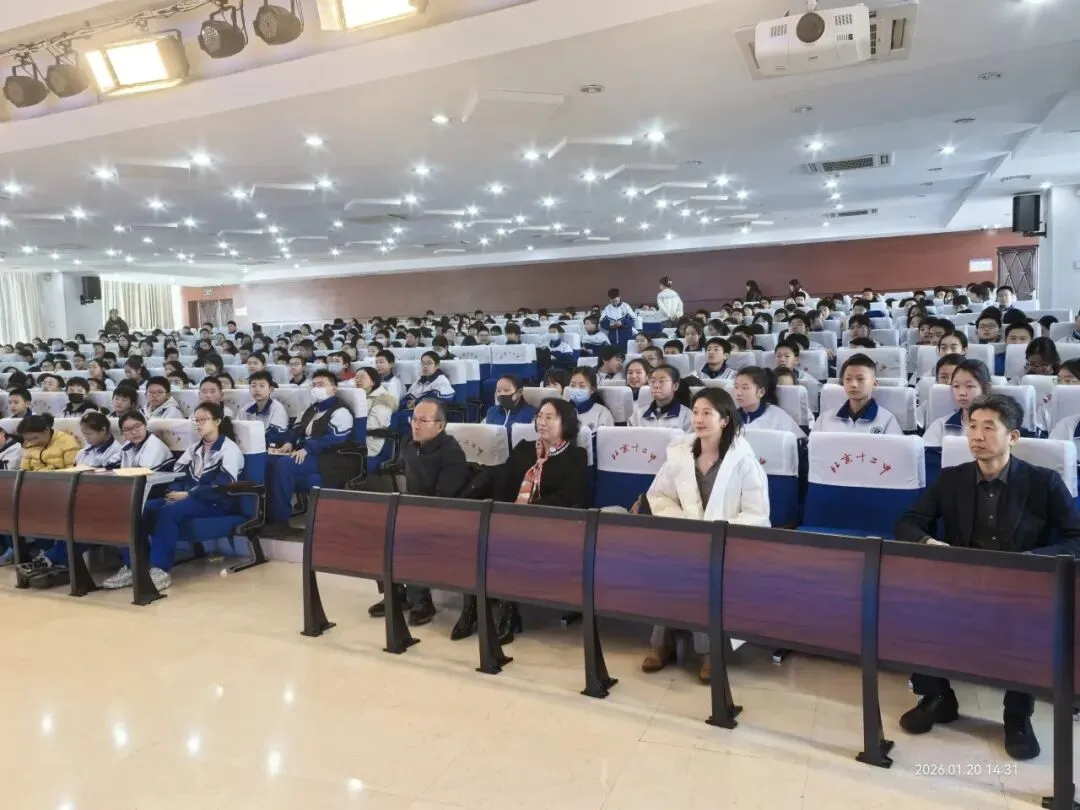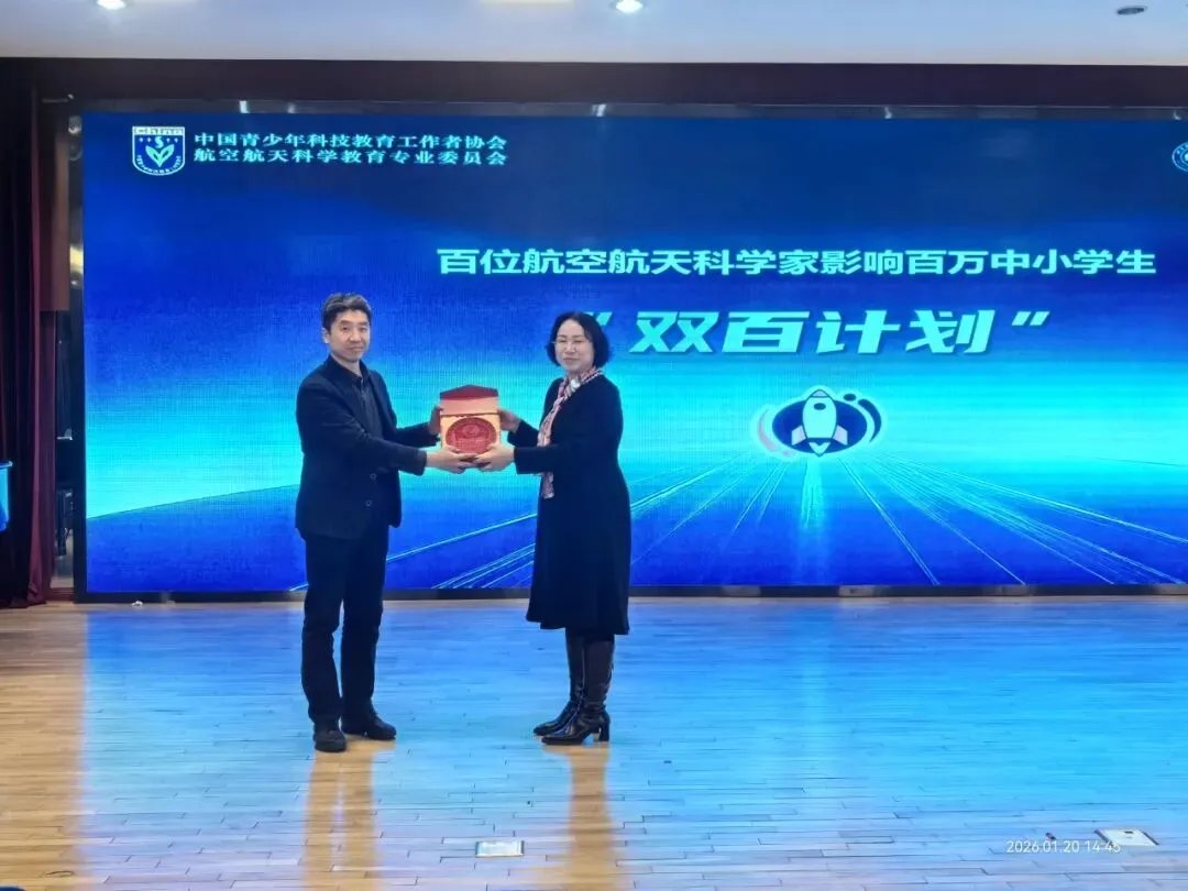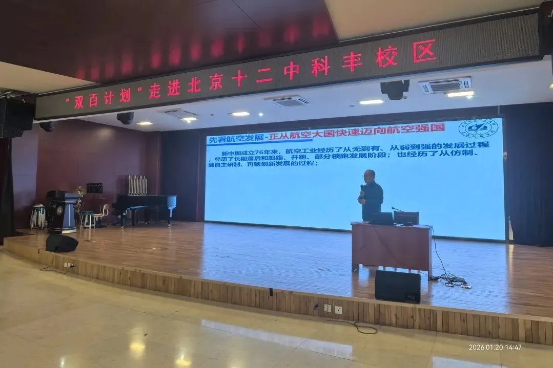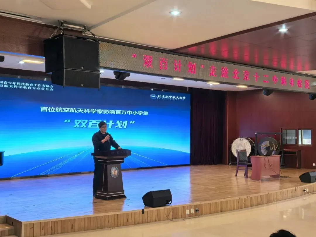 2026年1月20日下午,在北京十二中科丰校区的报告厅内,一场关于星空、坚守与担当的科学对话温情上演。由中国青少年科技教育工作者协会、北京航空航天大学共同发起的“双百计划”航空航天科学家进校园活动隆重举行,以科技为桥、以精神为炬,为初一年级师生带来了一场兼具知识厚度与精神温度的视听盛宴。中国青少年科技教育工作者协会“双百计划”专家郑彦良教授、中国青少年科技教育工作者协会航空航天科学教育专委会办公室谷玉红、“双百计划”北京负责人蔺福佳,北京十二中科丰校区史卫东校长及初一年级全体师生共同见证了这一意义非凡的时刻。