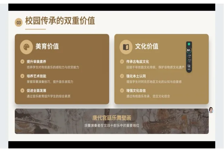 展望未来,小乐器进课堂教师研修团队将重点推进三项工作:一是持续培训并系统整理培训成果,构建完善的“文本+视听”一体化教学资源包,通过分享教学视频、提供实时答疑等方式,为教师教学实践提供全方位支持;二是收集筚篥演奏小组成员更多的曲目演奏视频,结合实际表现开展针对性指导,精准提升教师演奏与教学水平;三是正式启动“筚篥进校园”试点工作,支持参训教师在所在学校开设兴趣课堂、组建学生社团,通过校园展演、成果展示等形式,培育本土美育资源挖掘和地方文化传承后备力量,推动阿克苏地区筚篥教学与传承队伍不断发展壮大,让古龟兹文明的丝路之声在校园久久回响。