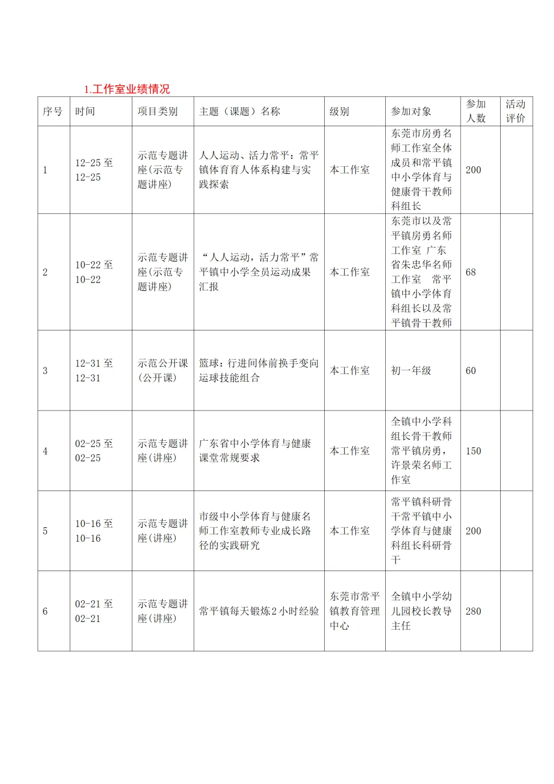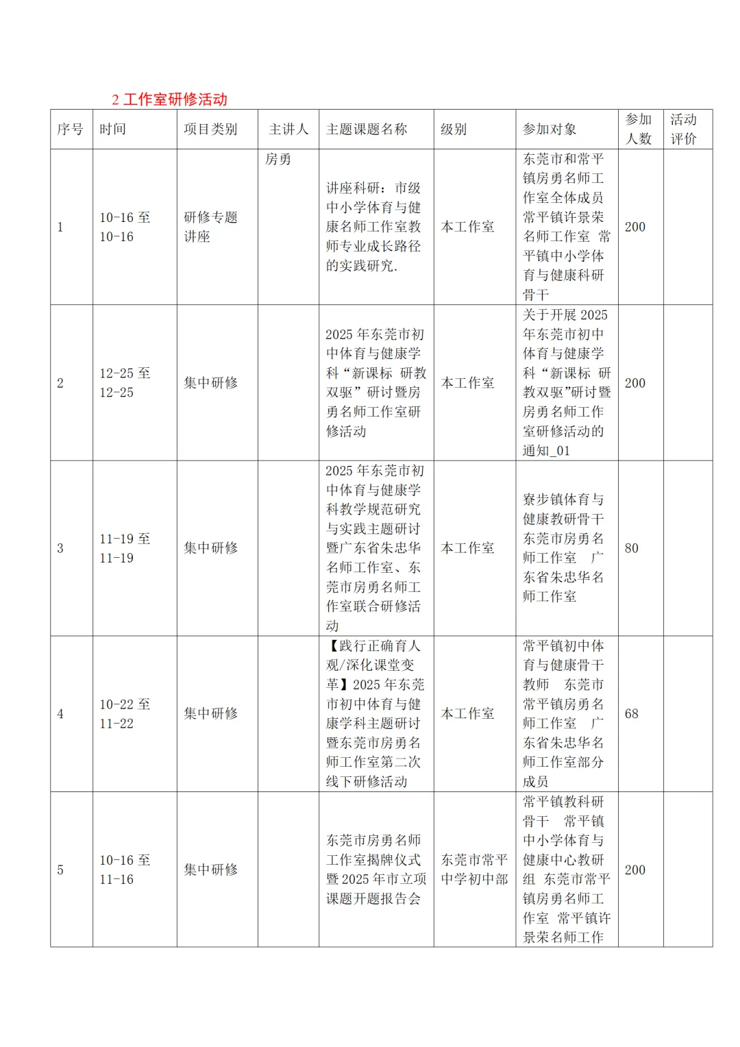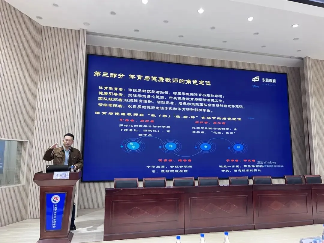 参与跨区域联合教研活动3次,与省内1个名师工作室开展2次交流合作,分享工作室建设经验与教学改革成果。主持人房勇在贵州省玉屏、东莞市寮步镇等多地开展专题讲座4次,分享"每天锻炼2小时+一节体育课"改革路径与省测工作经验,覆盖教师1000余人次。工作室经验入选东莞市体育教育改革典型案例,1篇成果在市级教研会议上作主旨发言。