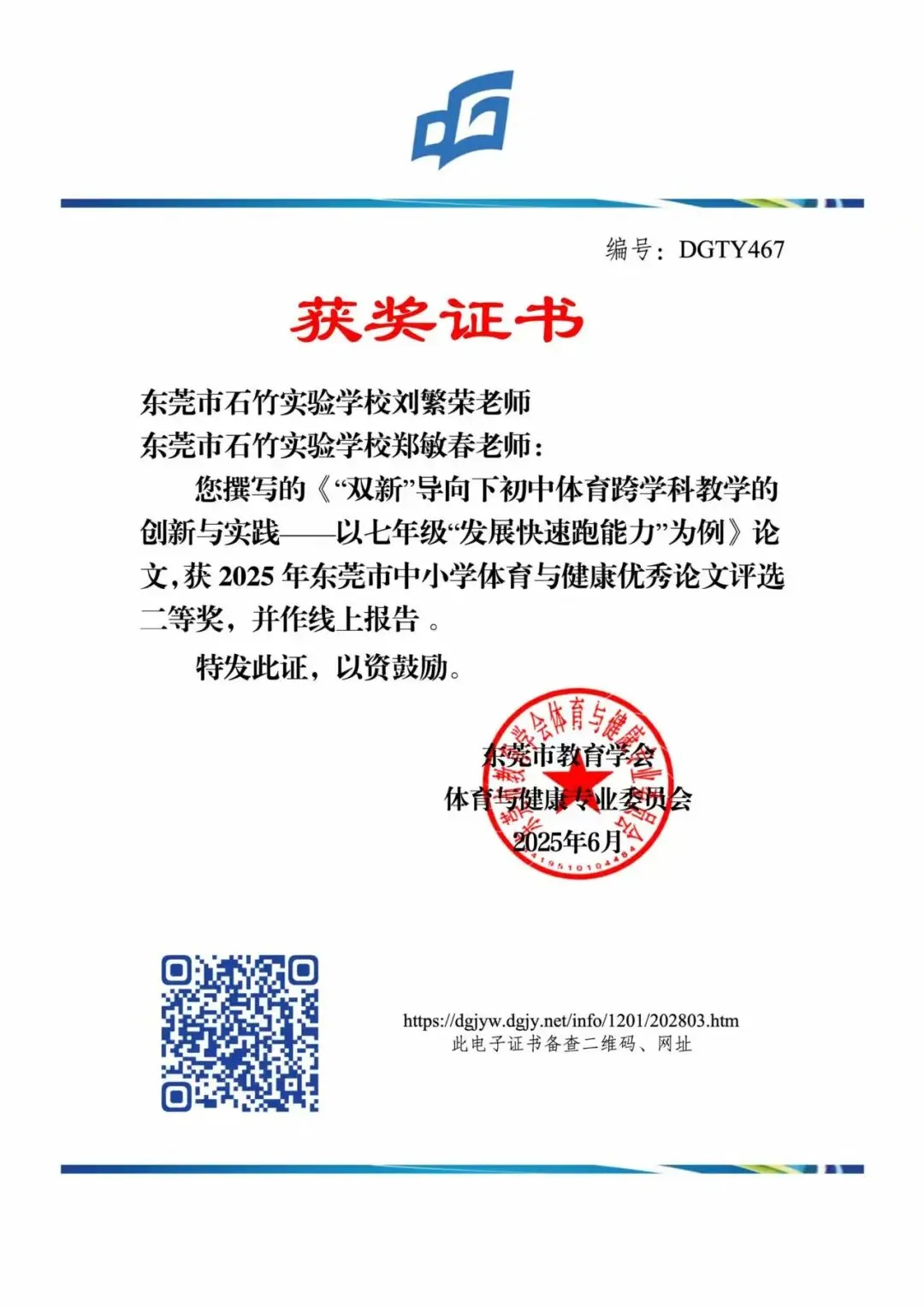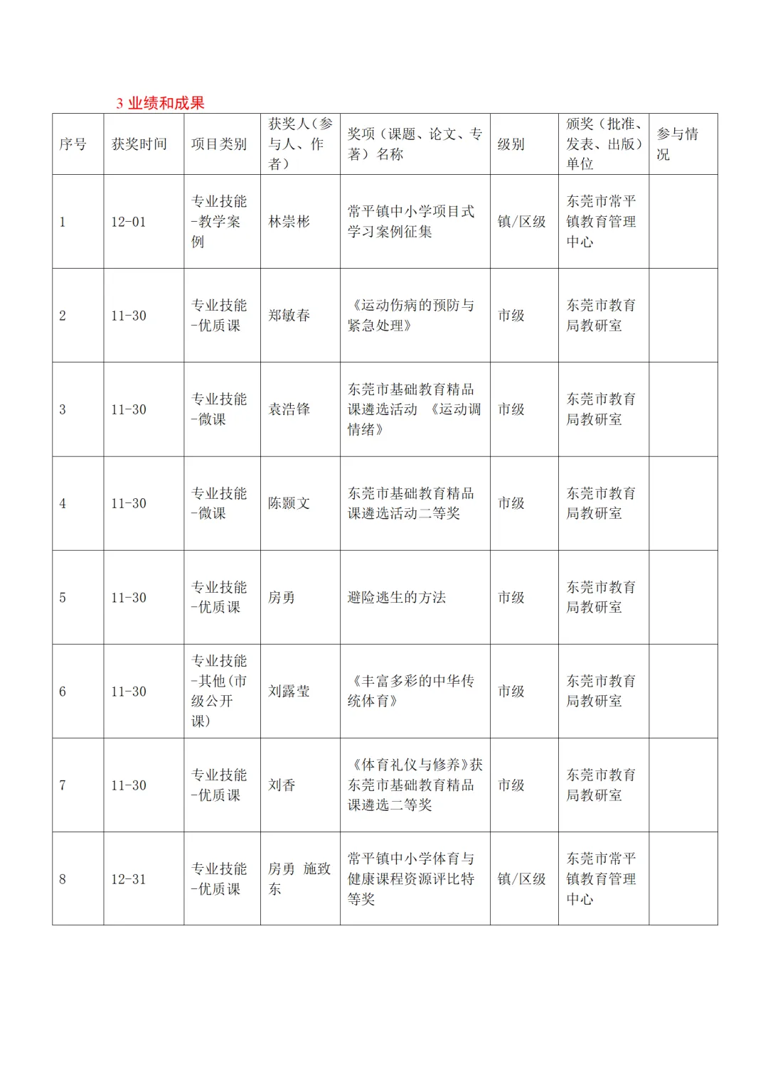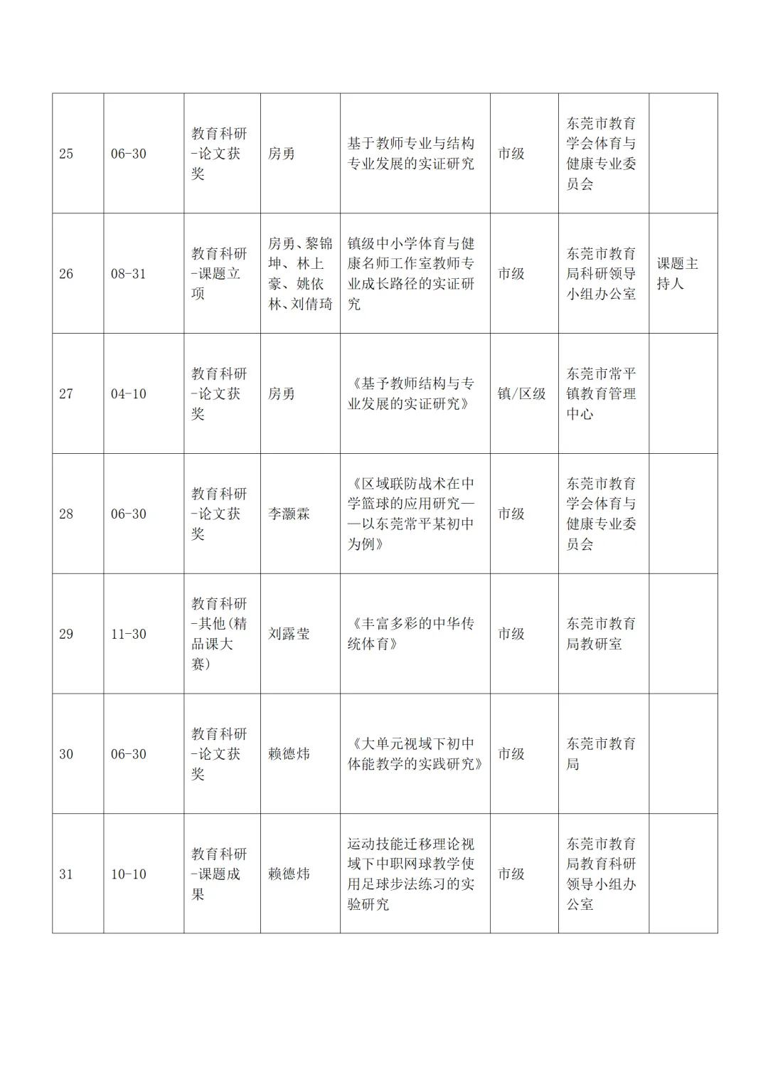 全年组织论文撰写专题培训2次,指导学员将教学实践转化为学术成果。工作室成员累计获奖或发表论文8篇,其中发表2篇,市级获奖6篇;获省级论文评比三等奖1项、市级论文评比二等奖3项、三等奖5项。编撰《东莞市房勇名教师工作室2025年度教学实践案例集》,收录学员优秀教学案例15篇,为区域体育教学提供实践参考。