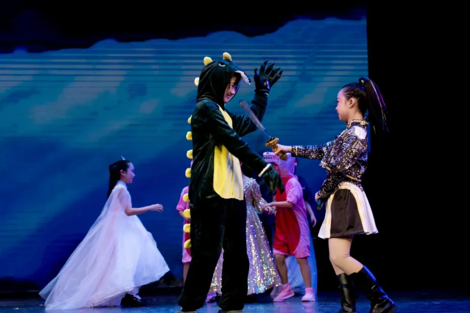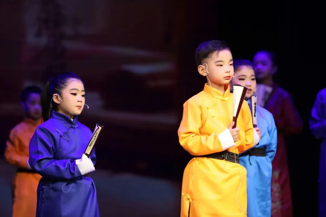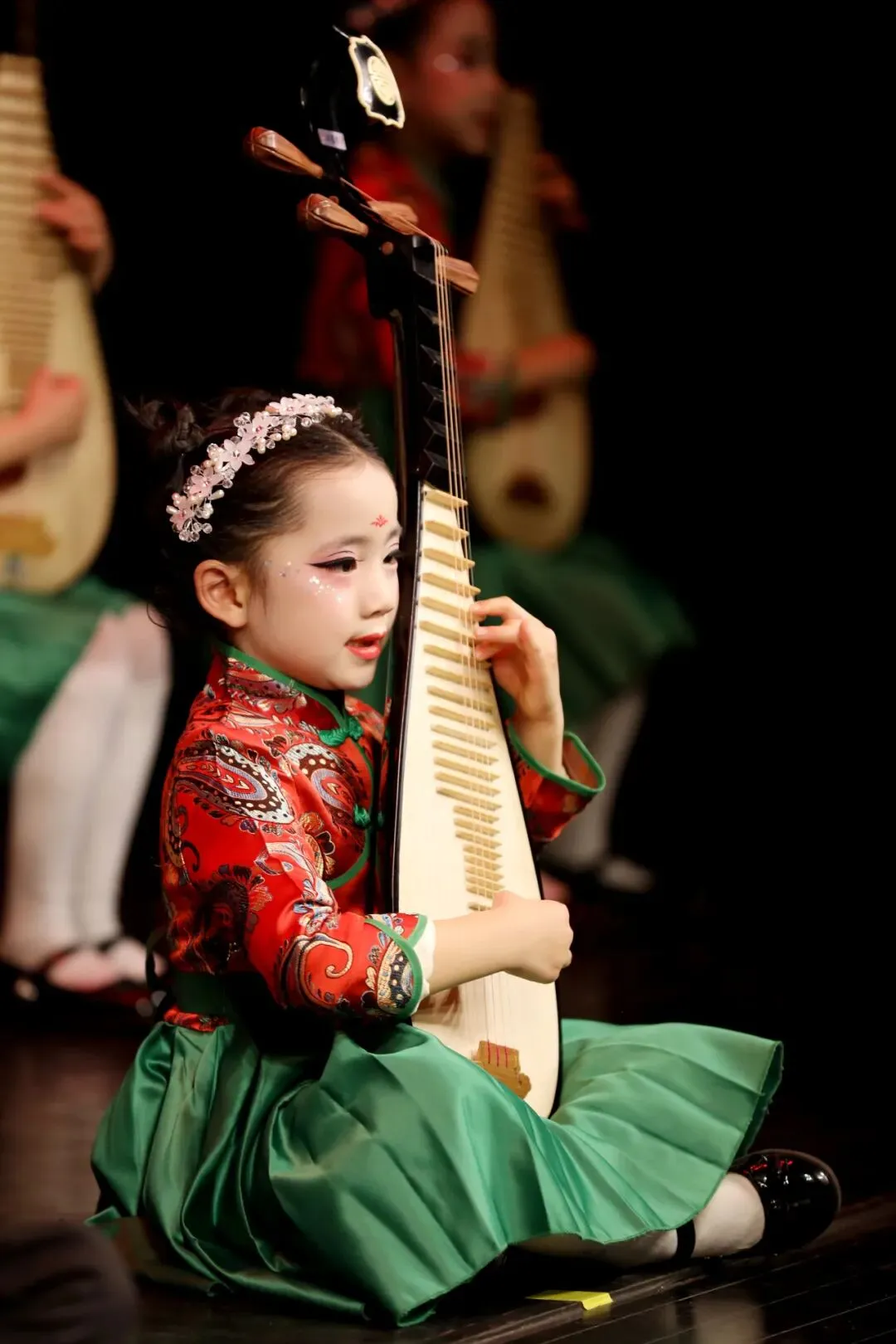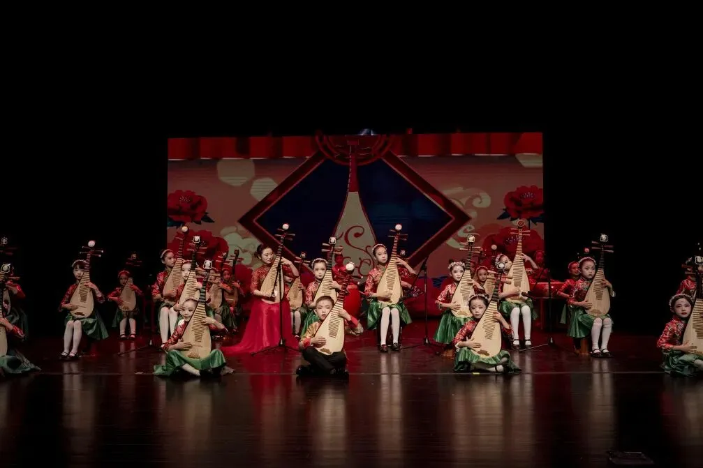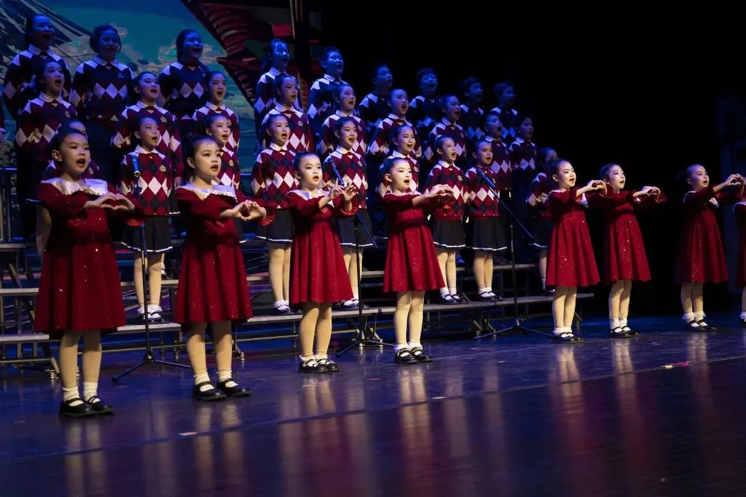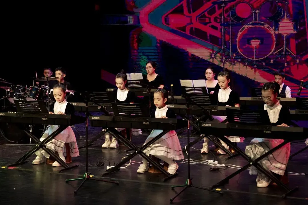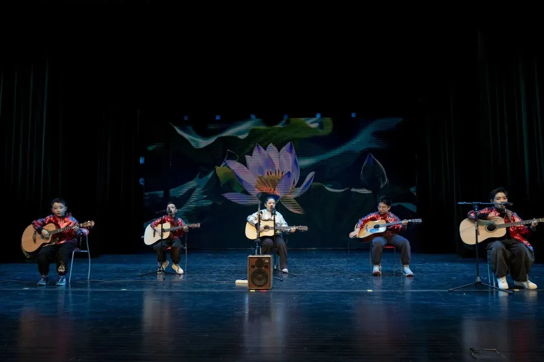 晚会节目精彩纷呈、形式多元,尽显艺术教育丰硕成果。开场舞澎湃激昂,瞬间点燃现场氛围;合唱《小美满》以清澈童声传递温暖,拉丁舞《新年快乐》洋溢青春活力;吉他弹唱《蓝莲花》诉说追梦初心,朗诵《莽撞人》铿锵弘扬忠勇精神;《鼓奏花香》将电子琴与架子鼓创新融合,中西乐器碰撞别样火花。钢琴、琵琶、小提琴等器乐专业演奏环节,学员们以娴熟技艺征服全场,彰显了青少年宫扎实的教学水准。最终,大合唱《有我》与群舞《成长在祖国的怀抱里》将晚会推向高潮,深情抒发 “请党放心,强国有我” 的赤子情怀。