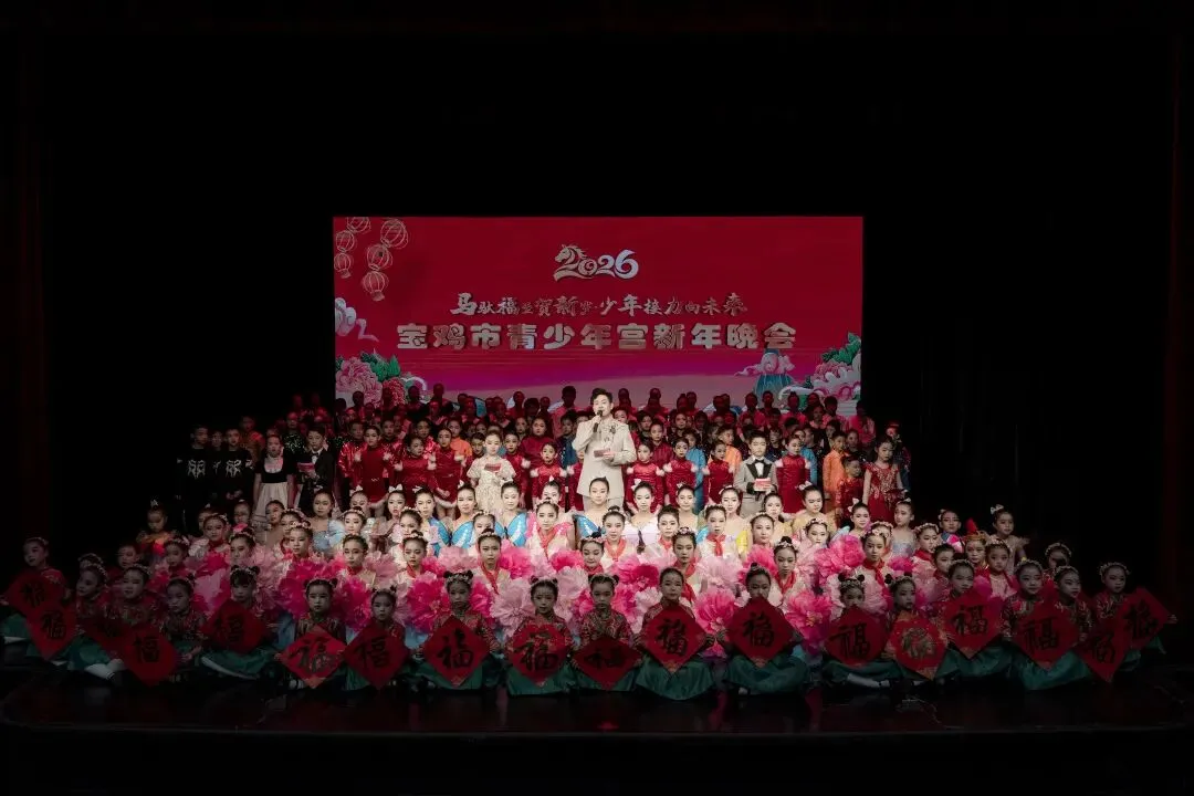 为落实立德树人根本任务,以美育为桥梁培育时代新人,让家国情怀在少年儿童心中生根发芽,2月4日,宝鸡市青少年宫举办"马驮福至贺新岁·少年接力向未来"2026年新年晚会。晚会以艺术为载体,将思想引领融入美育实践,在团市委、市文旅局、市文化艺术中心、市科技馆、市图书馆、宝烟社区等相关单位的关心指导和大力支持下,为观众献上了一场格调高雅、充满朝气的新年视听盛宴,展现了新时代少年儿童昂扬向上的精神风貌,激发了广大青少年爱党爱国热情,坚定了文化自信。