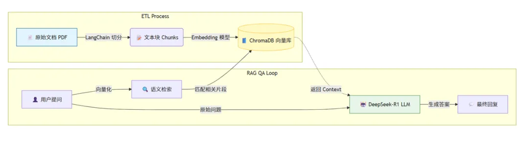 def ask_ai(): """ 函数功能:启动问答助手 """ print("🤖 AI 助手正在初始化...") # 1. 加载现有的向量数据库 embeddings = OllamaEmbeddings(model=MODEL_NAME) vectordb = Chroma(persist_directory=DB_PATH, embedding_function=embeddings) # 2. 初始化本地大模型 DeepSeek# temperature=0.1 表示让 AI 回答严谨一点,不要瞎编 llm = Ollama(model=MODEL_NAME, temperature=0.1) # 3. 构建“检索问答链”# k=3 表示每次去数据库找 3 段最相关的资料给 AI 参考 qa_chain = RetrievalQA.from_chain_type( llm=llm, retriever=vectordb.as_retriever(search_kwargs={"k": 3}), return_source_documents=True # 让 AI 告诉我们答案出自哪里 ) # 4. 进入问答循环while True: query = input("\n🙋 请输入问题 (输入 exit 退出): ") if query == "exit": print("👋 再见!") break print("🤔 DeepSeek 正在思考...") # 调用 AI 进行回答 result = qa_chain.invoke({"query": query}) # 打印结果 print("\n💡 AI 回答:") print(result['result']) print("\n📚 参考文档:") for doc in result['source_documents']: # 打印出参考了哪个文件的第几页 print(f"- {os.path.basename(doc.metadata['source'])} (第 {doc.metadata['page']+1} 页)")# 程序入口if __name__ == "__main__": # 如果是第一次运行,或者添加了新文档,请取消下面这行代码的注释: # create_vector_db() # 启动问答 ask_ai()