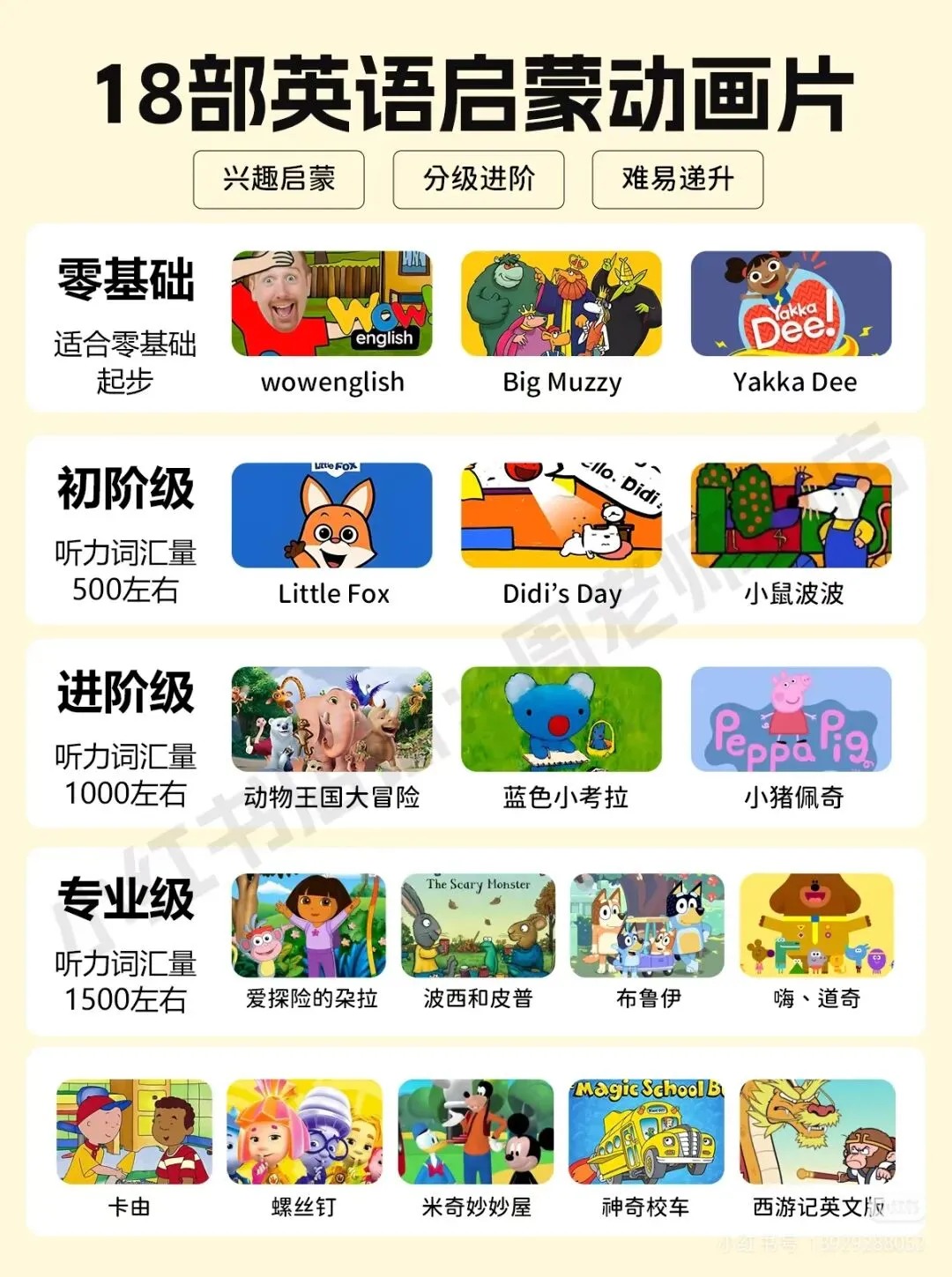 推荐动画:《Super Simple Songs》(外教唱跳启蒙)、《Wow English》(夸张有趣的外教真人互动)、《Big Muzzy》(绝佳的第一部慢速故事类动画)