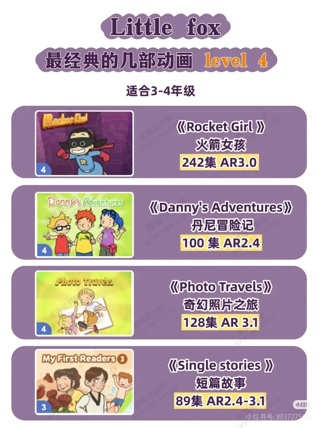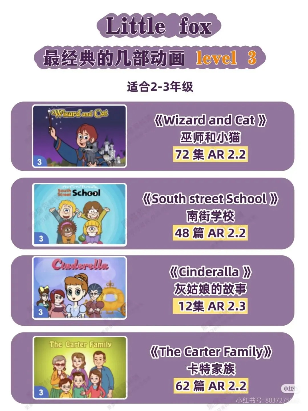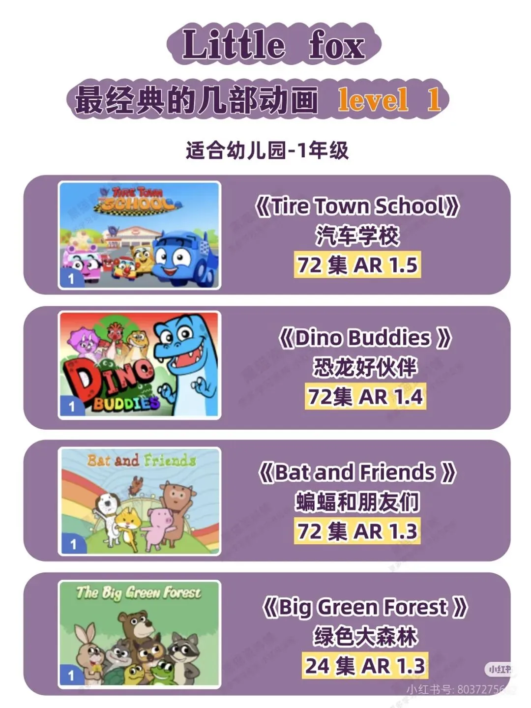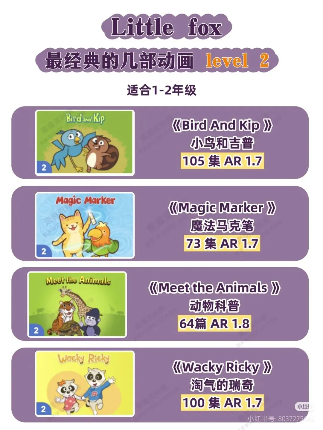 《Peppa Pig》第一季(大量生活用语,看完就可以用!)、 《Little Fox》L2—L3系列(如《Bird and Kip》)故事类增强,语言更丰富。