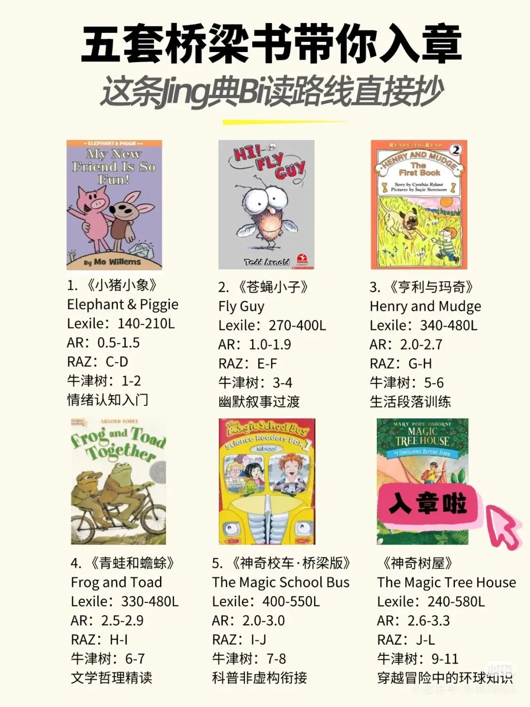 坚持牛津树高阶、RAZ(F-J+),并引入《Fly Guy》等桥梁书,向《Magic Tree House》等初章书过渡。