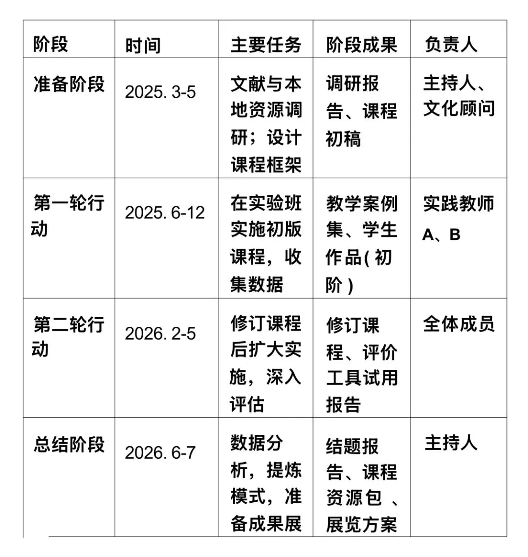 时间规划:研究周期通常为1-2年。例如:“2026年3月—2027年7月”,涵盖课程开发、实施与展示全过程。