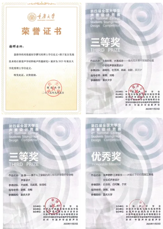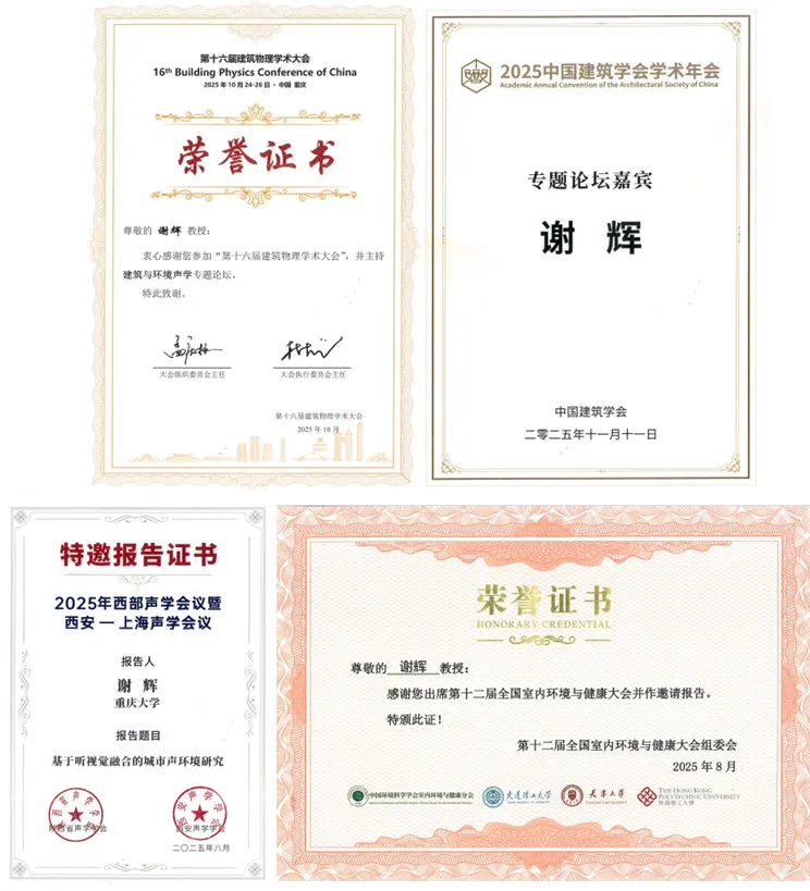(2)Zhong B, Xie H*, Zhang Z, et al. Non-linear effects of ecoacoustic indices on urban soundscape assessments based on gradient boosting decision trees in summer Chongqing, China[J]. Building and Environment, 2025, 278: 112984.(IF=7.1 JCR一区)