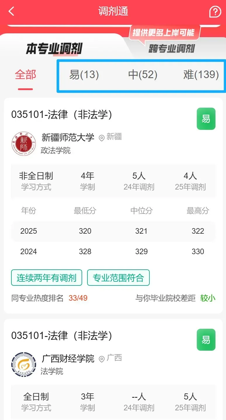 别再凭感觉投递了。我们基于2025年数万条真实的调剂录取数据,根据你的初试分数智能匹配目标,将调剂推荐院校划分为难、中、易三个梯度。